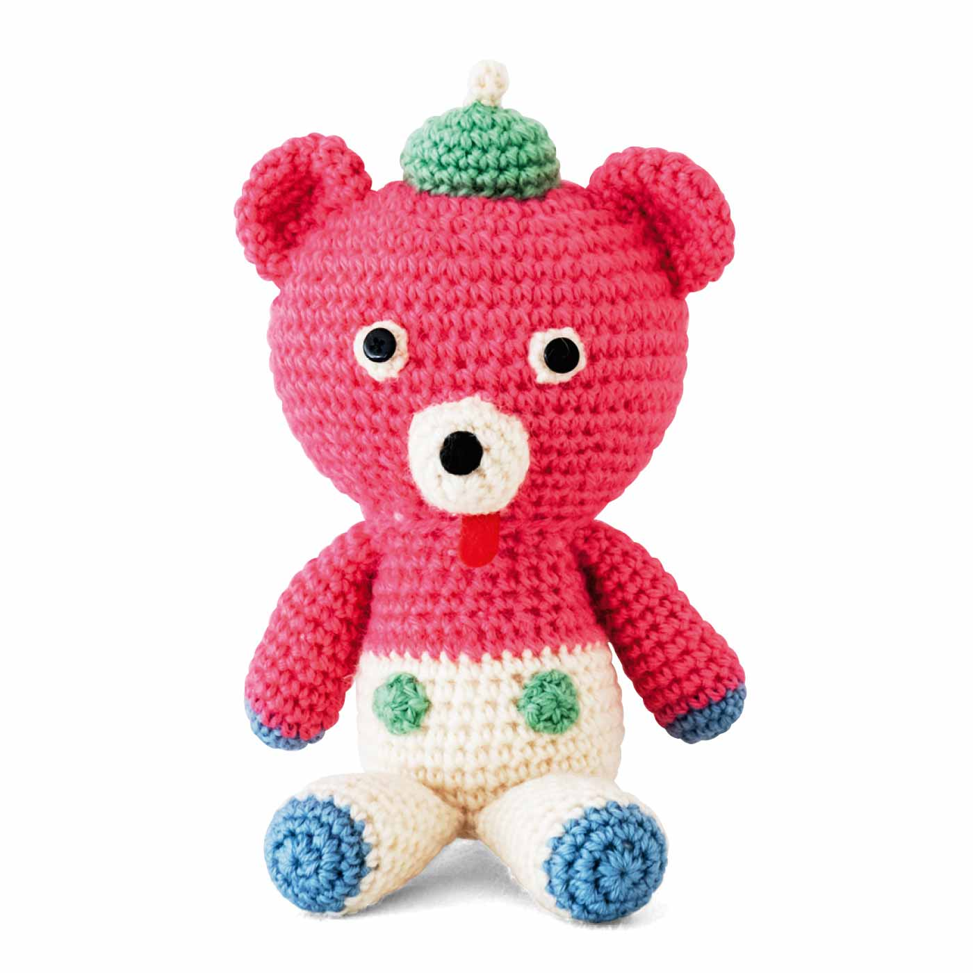 愛らしいピンク色の〈やさしいクマさん〉1体分の毛糸やわた、目玉用ボタンなどの材料がセットされており、届くとすぐに作りはじめることができます。(※かぎ針は別売りです、見本作品は、かぎ針7/0号を使用)