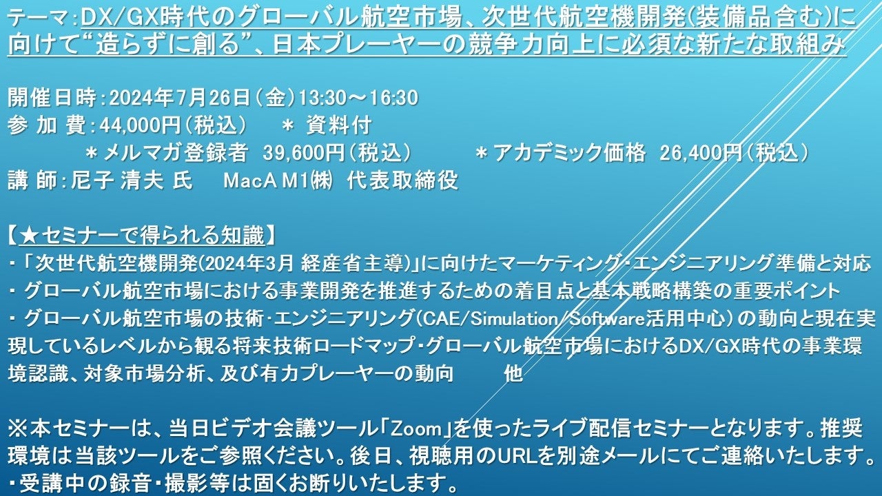 【ライブ配信セミナー】DX/GX時代のグローバル航空市場、次世代航空機開発(装備品含む)に向けて“造らずに創る” 7月26日(金)開催 主催:(株)シーエムシー・リサーチ