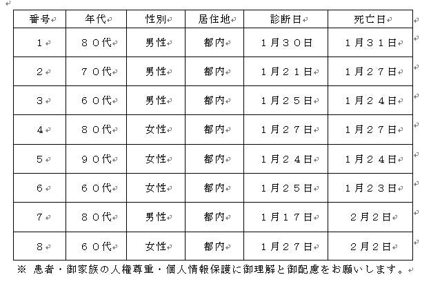 都内で新型コロナウイルスに感染した方が死亡されましたのでお知らせします。