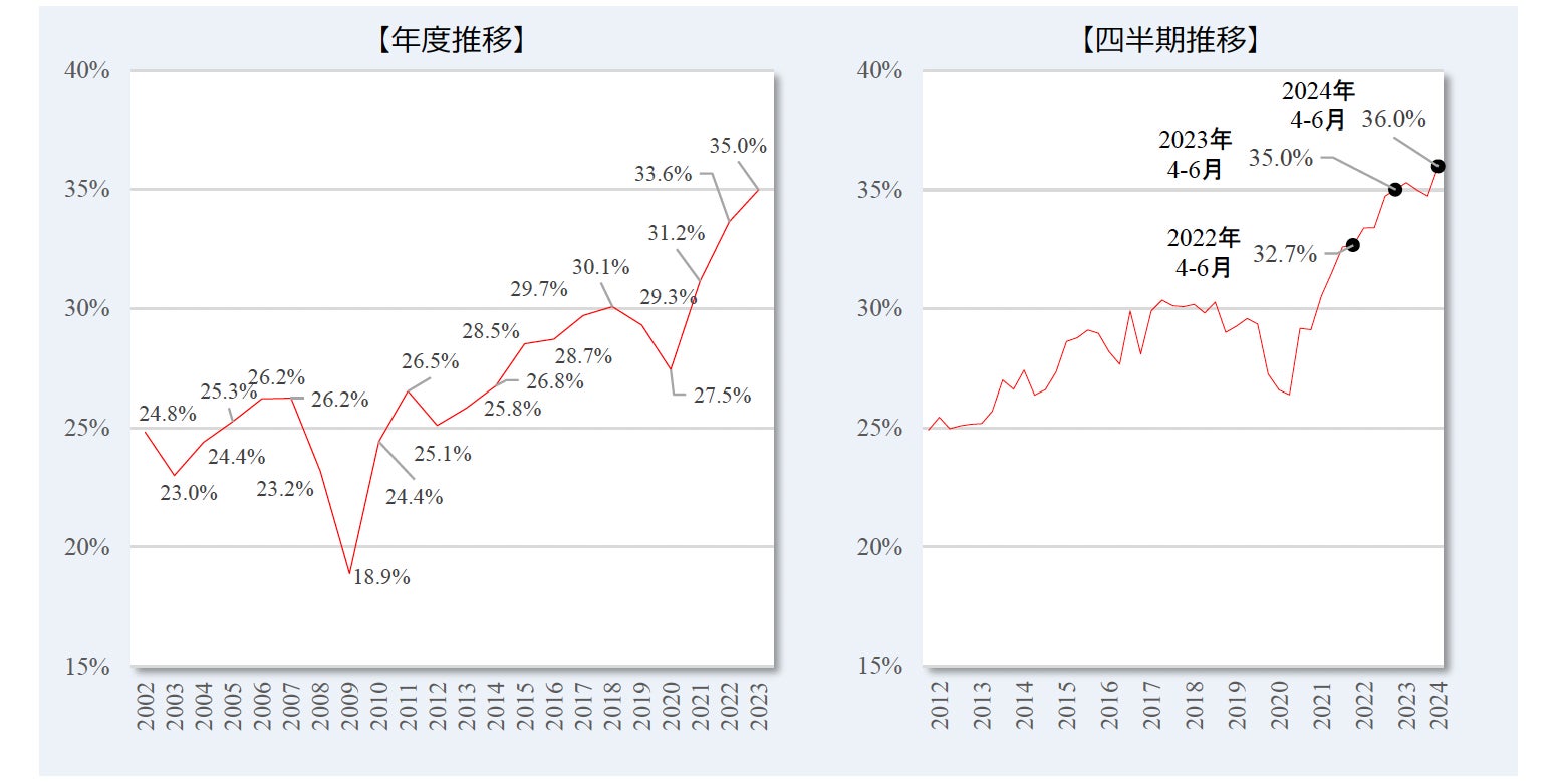 新型コロナウイルスの感染が拡大し始めた2020年1-3月期を起点に大きく水準を切り下げたが、翌年2021年1-3月期には概ね感染拡大前の水準に復した。以降、最高値※1を更新しながら上昇を続けており、足元2024年4-6月期は過去最高値となっている。