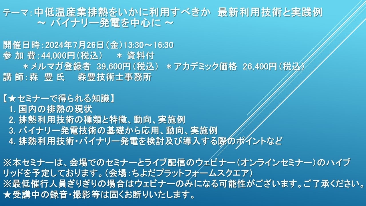 【会場/ライブ配信ハイブリッドセミナー】中低温産業排熱をいかに利用すべきか 最新利用技術と実践例 ~ バイナリー発電を中心に ~ 7月26日(金)開催 主催:(株)シーエムシー・リサーチ