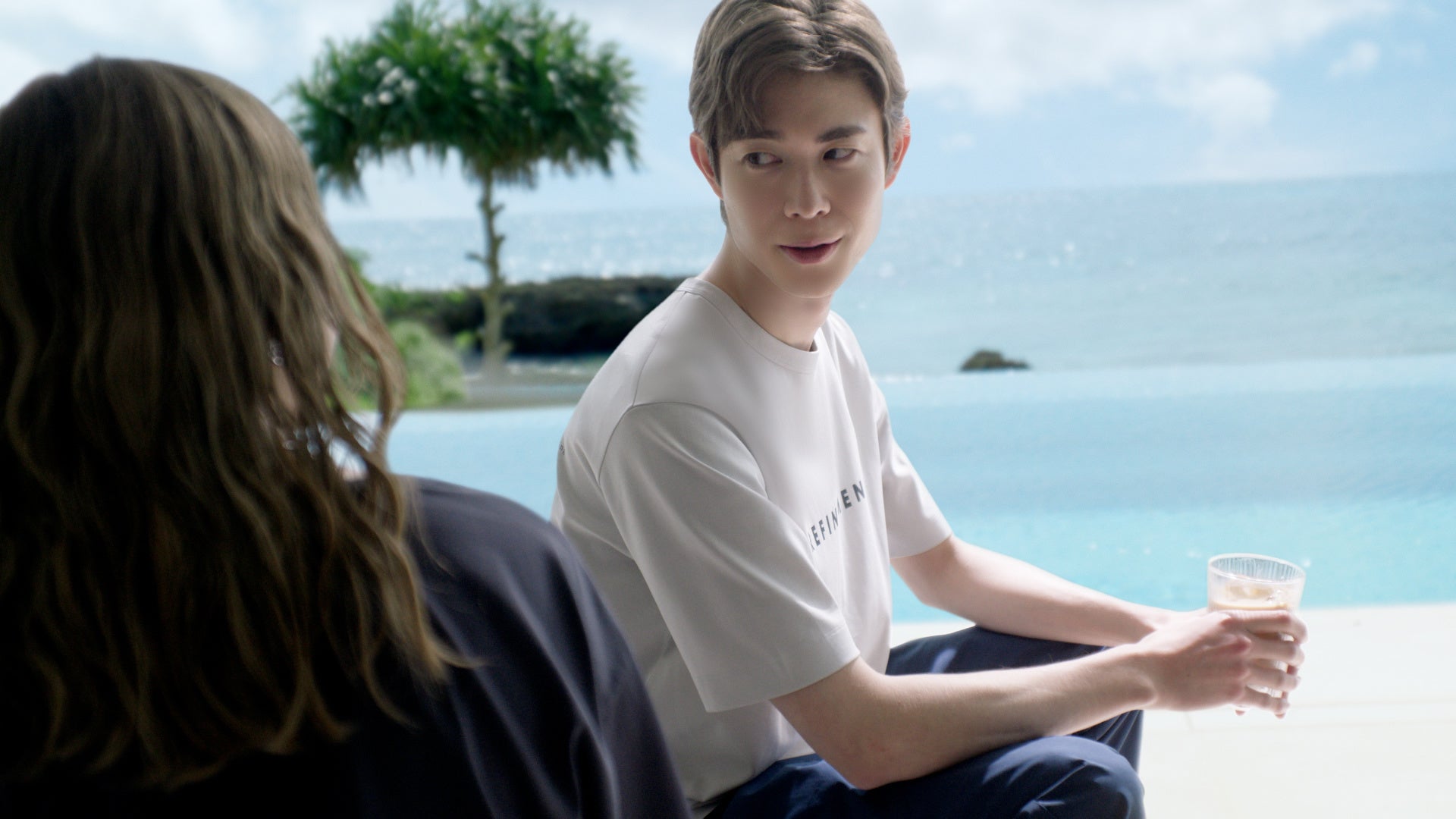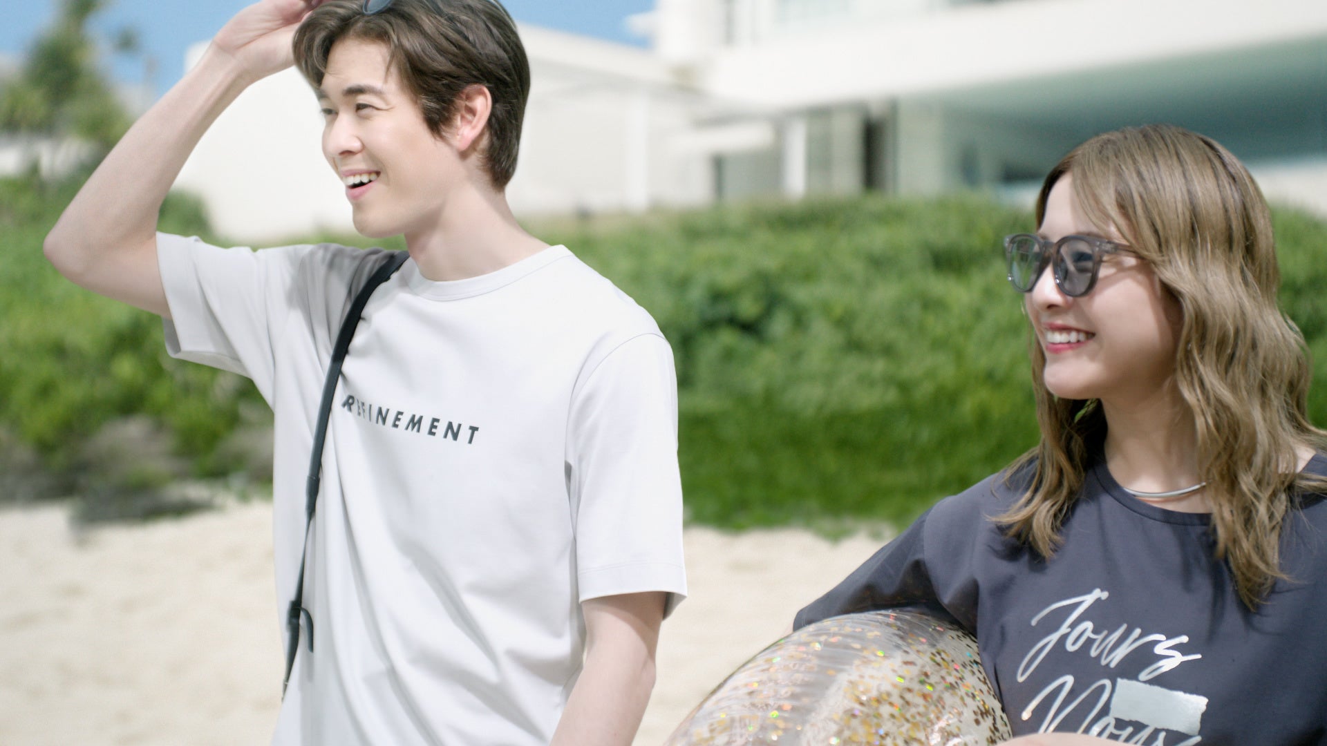 上品な光沢感と触れるだけで涼しい肌ざわりのTシャツで、夏を爽やかに楽しむふたり。無邪気な笑顔が弾ける、ふたりきりのリゾートの夏。