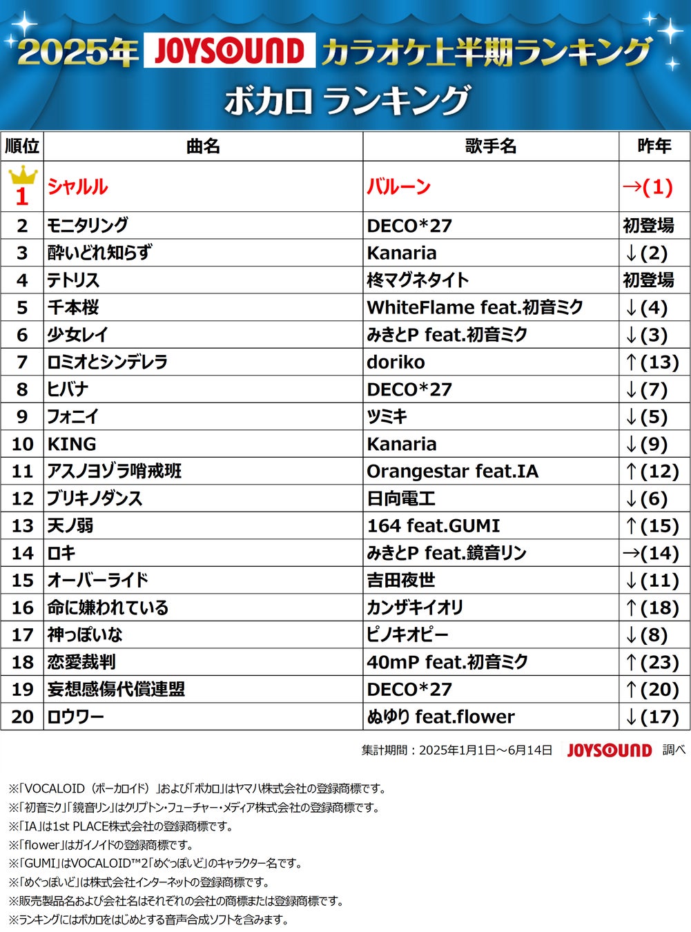 ▽2025年JOYSOUNDカラオケ上半期ランキング 特集ページ: