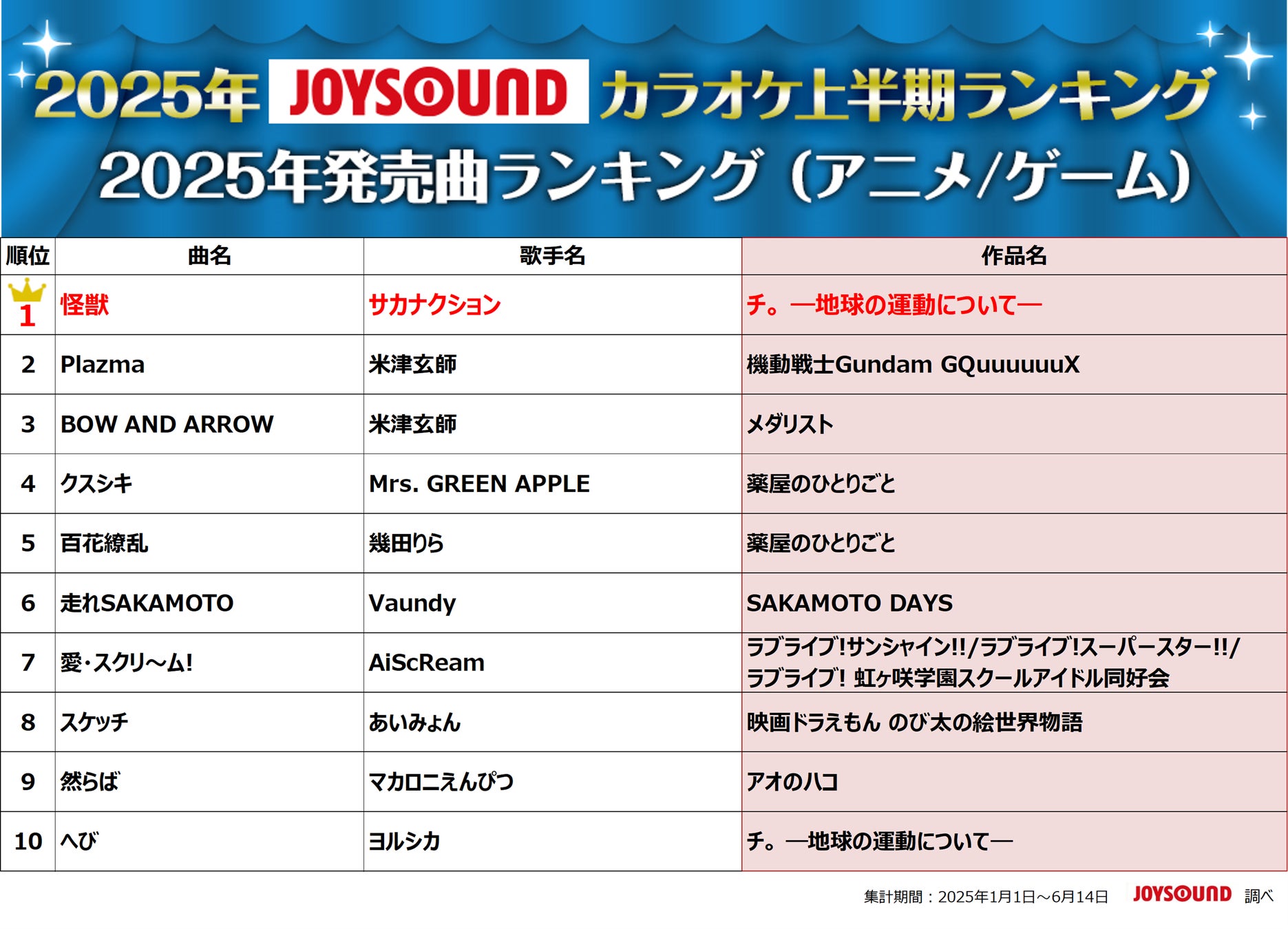 ◆2025年発売曲ランキング(アニメ/ゲーム)
