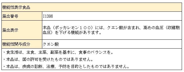 「ポッカレモン100」には、レモンの健康成分の1つであるクエン酸が含まれ、クエン酸が血管内皮の筋肉を弛緩させることで血管が拡張し、また血小板凝集の抑制や血液凝固を抑制することにより血液の流動性が改善され高めの血圧を下げる効果が確認できたため、“高めの血圧(収縮期血圧)を下げる”と表示した機能性表示食品「ポッカレモン100」としてリニューアル発売します。(※4)