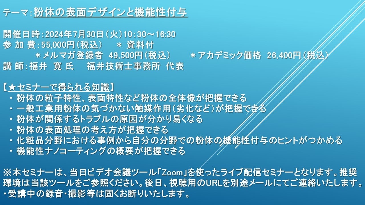 【ライブ配信セミナー】粉体の表面デザインと機能性付与 7月30日(火)開催 主催:(株)シーエムシー・リサーチ