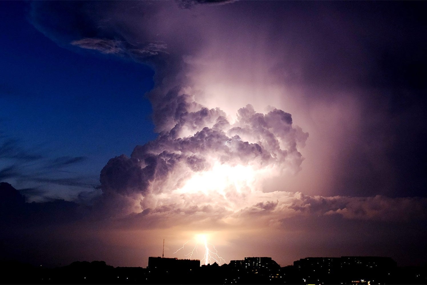 雷雲。雲の中で放電現象が起きると「雷光」が見え「雷鳴」が轟く。雲の中だけで放電するのを「雲放電」と呼ぶ。