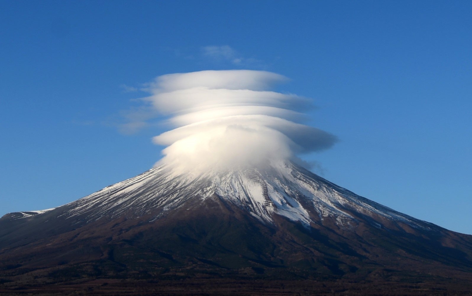多重笠雲。湿った風が富士山を越える際にできる笠雲。五重になっているのはとても珍しい。