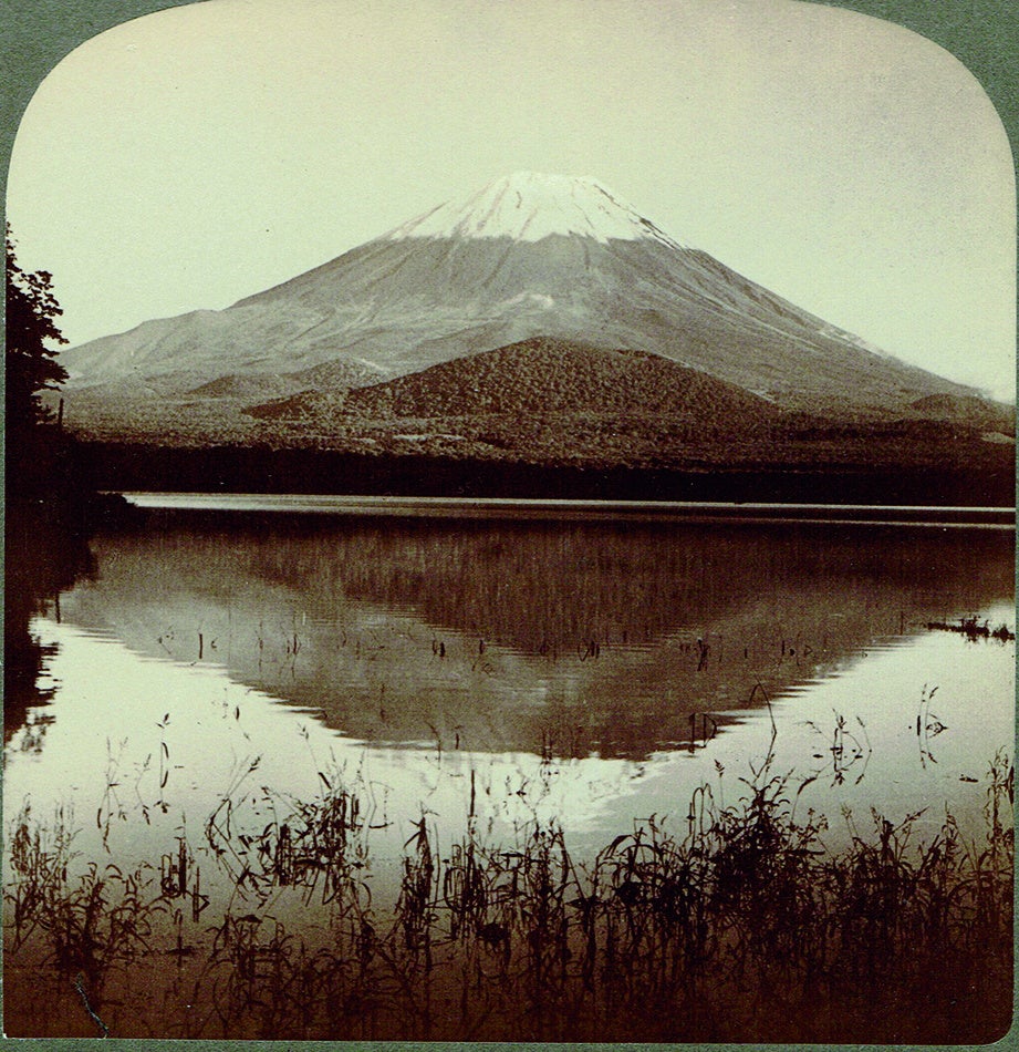 写真家、ハーバード・ジョージ・ポンティングが1903年に葛飾北斎の浮世絵を参考に撮影したともいわれる富士山。精進湖の湖面に波が立った時に撮ることで、ふたつの富士山の姿を表現した。