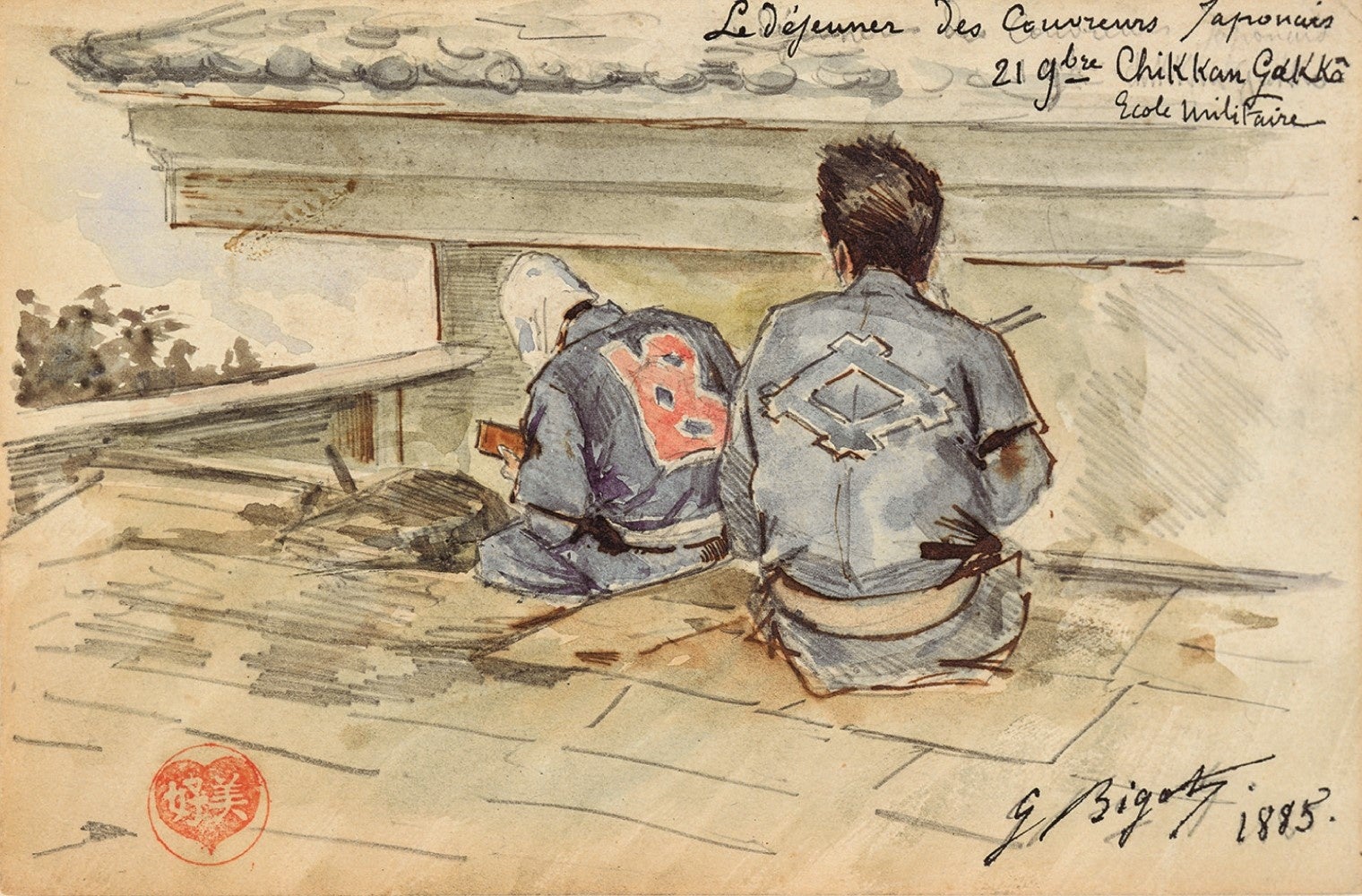 風刺画で知られるジョルジュ・ビゴーの『日本の屋根葺き職人の昼食 東京・陸軍士官学校にて』。「フランス生まれの江戸っ子」を自認したビゴーは、自身の名前に「美好」を当て字としていた。