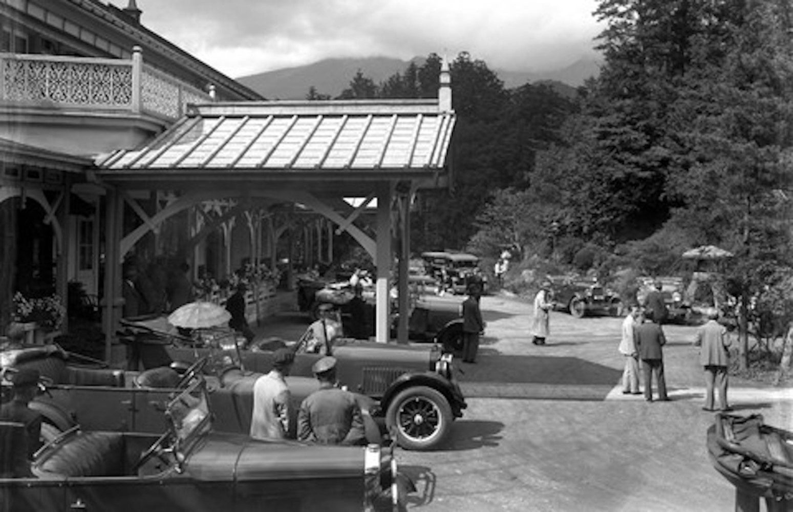 大正期の「日光金谷ホテル」。二代目の金谷眞一は、客の送迎や観光に利用するため自動車を導入した。