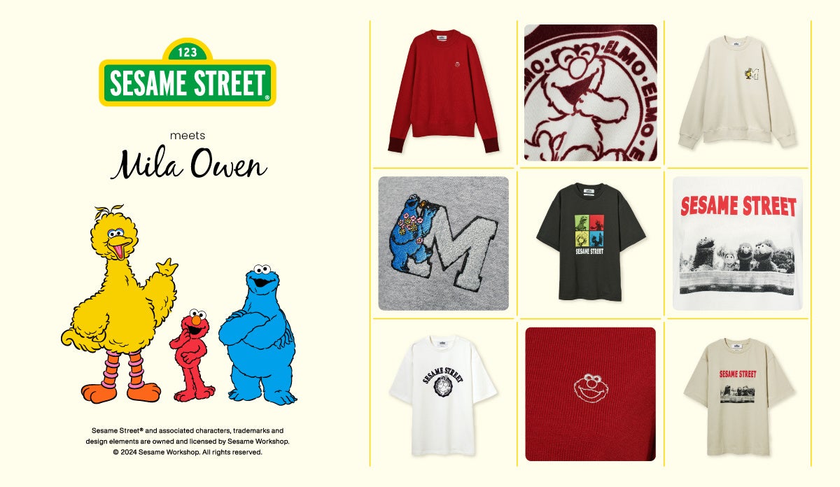 セサミストリートの仲間たちがMila Owen定番のベーシックアイテムにデザインされた、遊び心溢れるコラボレーションアパレルがラインアップ