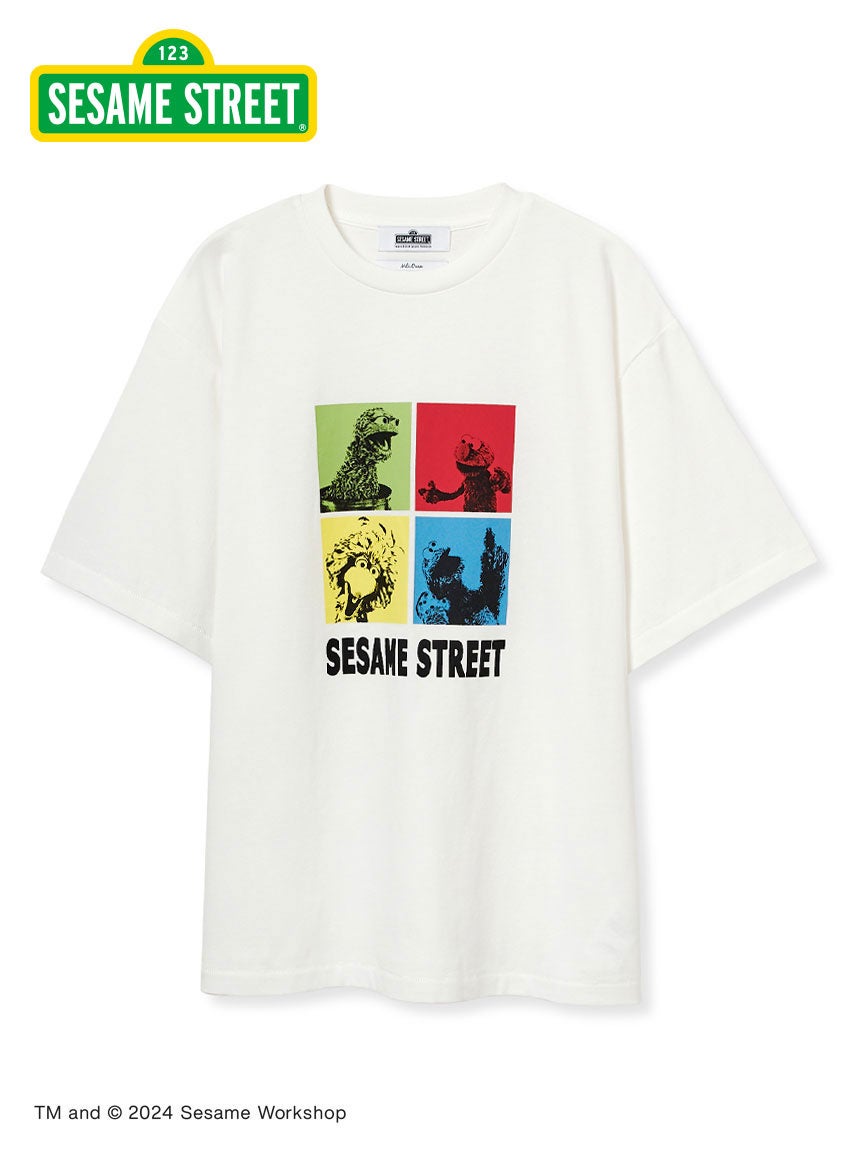 セサミストリートの代表的キャラクター、エルモ、クッキーモンスター、ビッグバード、オスカーの4キャラクターを、各キャラクターのカラーに合わせて配置しキャッチーなプリントを施した遊び心溢れる一着。