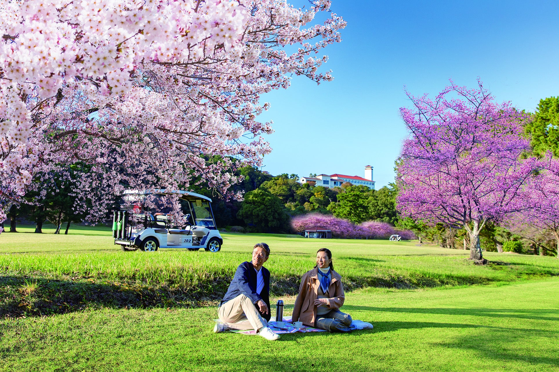 コース内を移動する際は、ガイドが運転する乗用ゴルフカートで周遊し、期間に合わせて4月上旬まで咲き誇る様々な桜を見ながら世界的コースの絶景も併せて見て絶景ポイントでティータイムもできる、青い海と様々な桜の色のコントラストが美しい春先取りの体験ツアーです。