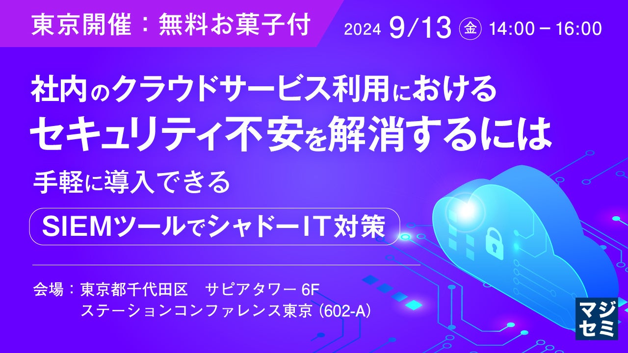 マジセミ株式会社は「【東京開催:無料お菓子付】社内のクラウドサービス利用におけるセキュリティ不安を解消するには」というテーマのセミナーを開催します。