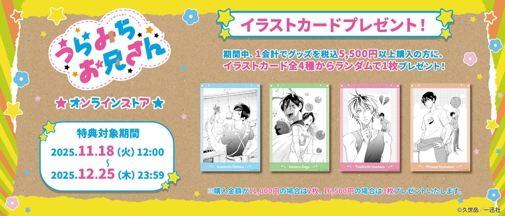 株式会社サイバード(本社:東京都品川区、代表取締役社長 兼 CEO 長嶋 貴之、以下「サイバード」)は、大日本印刷株式会社(本社:東京都新宿区、代表取締役社長 北島 義斉、以下「DNP」)との共同事業として、久世 岳先生による、comic POOLにて連載中の人気漫画『うらみちお兄さん』の限定グッズを受注販売する「うらみちお兄さんオンラインストア」を、2025年11月18日(火)~12月25日(木)までの期間限定で開催します。