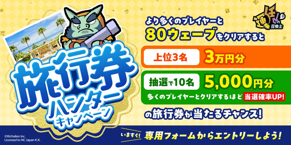 より多くのプレイヤーと80ウェーブをクリアすると、上位3名に3万円分/抽選で10名に5,000円分の旅行券が当たるキャンペーンを開催します。