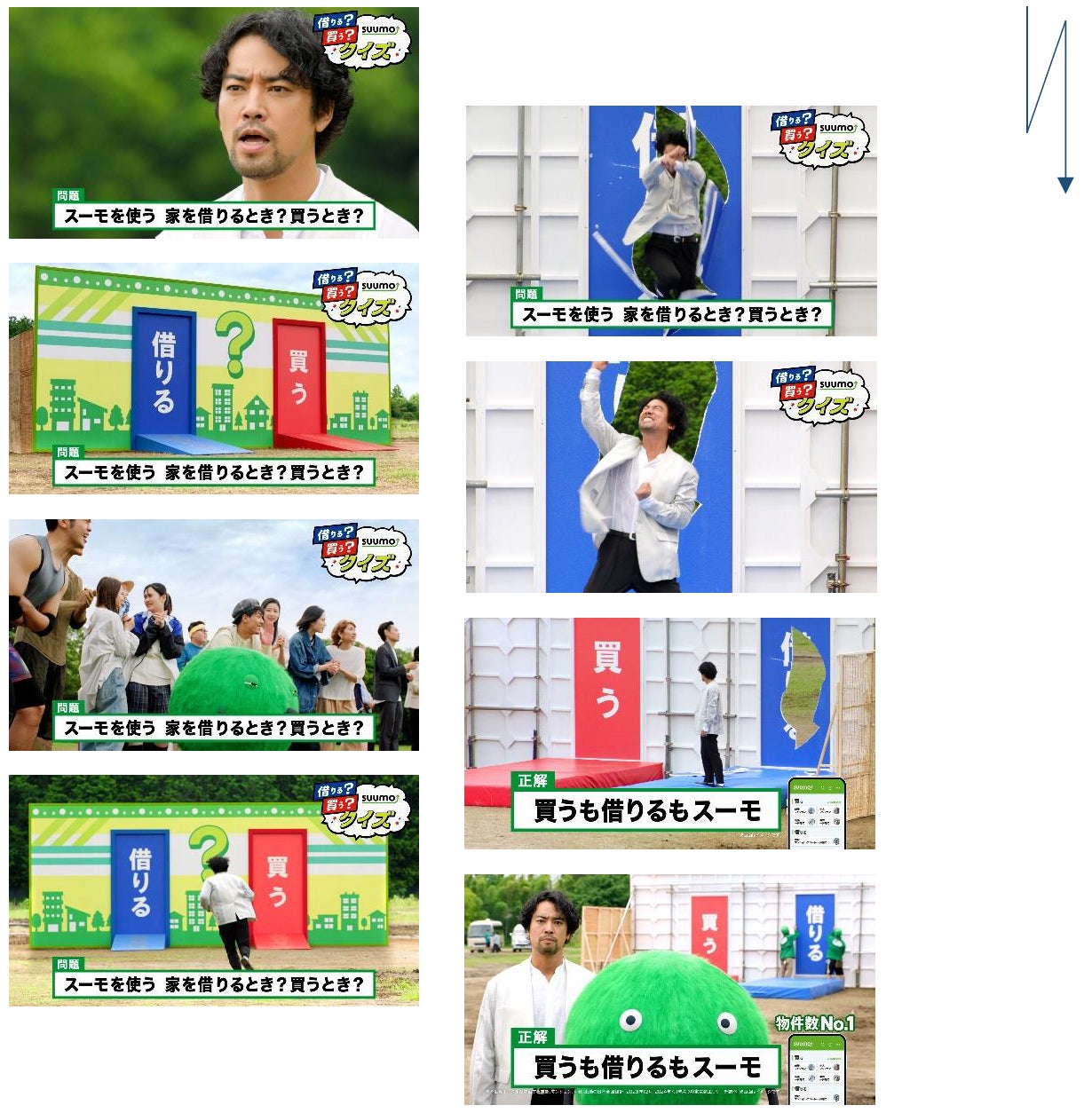 バラエティー番組の二択クイズで桐谷さんが最終問題に挑む場面。スーモを先頭にギャラリーが固唾(かたず)をのんで見守る中、出された問題は…「『SUUMO』を使うのは、家を借りるとき?買うとき?」。