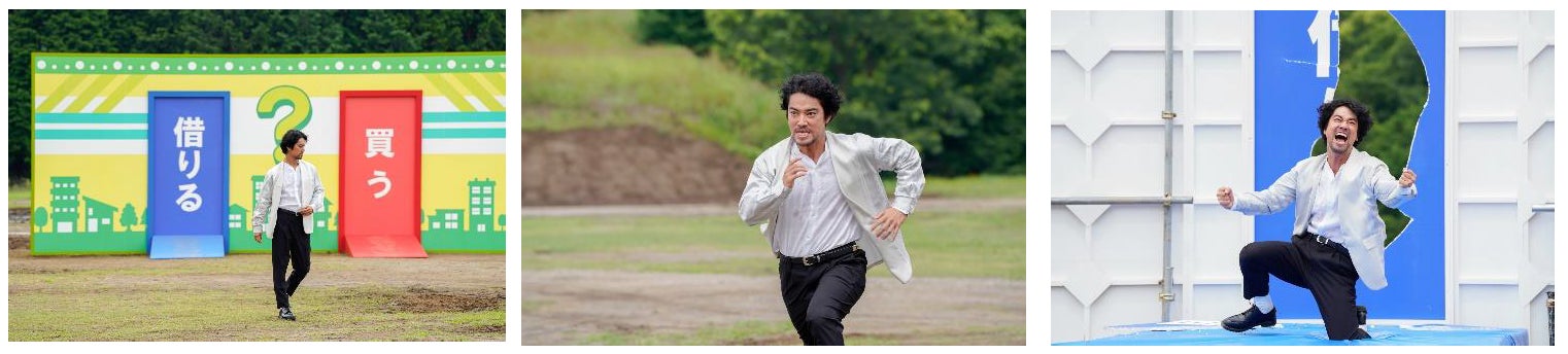 本CMの見どころは、桐谷さんがクイズの正解をめがけて「借りる」の扉へ飛び込むシーン。アクション監督と軽く言葉を交わすと、1発目のカットから力強くも軽やかなダイブを決め、カットがかかった瞬間に撮影陣から拍手が起こる一幕も。撮影スタッフと盛り上がりながら、和気あいあいとした雰囲気で細部までアクションに磨きがかかります。最終的には、ダイブの瞬間の細かい手足の動きから、ぶち破る扉の破れ方まで気を配り、5テイク目で現場一同大満足の仕上がりとなりました。