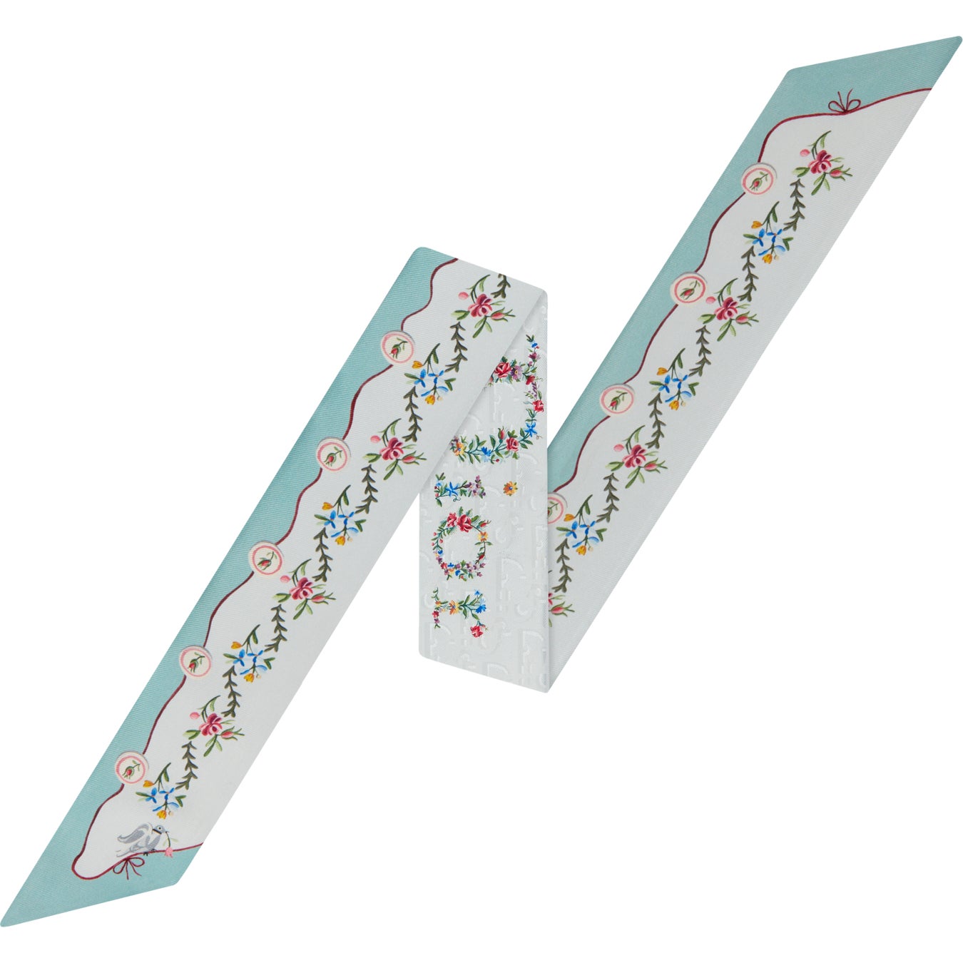 18世紀のエンブレムからインスピレーションを得た、繊細な花柄の「レボリューション フラワーズ」プリントは、「ディオール ブックトート」バッグ、「サドル」バッグ、そして “D, I, O, R”チャームをあしらった「レディ ディオール」バッグや、スモールレザーグッズに咲き誇ります。シルクスカーフやミッツァも、この洗練されたデザインで彩られ、ブルーとピンクの色合いで表現されています。これは、フランスのテキスタイルアートへのオマージュです。1956年の「パストラル」ドレスに敬意を表したロマンティックな「ダヴ & ローズ」のモチーフは、バラと鳩の形をしたプラメティスを表現し、ホワイトの「レディ ディオール」やライトブルーの「レディ D-ジョイ」に施されています。