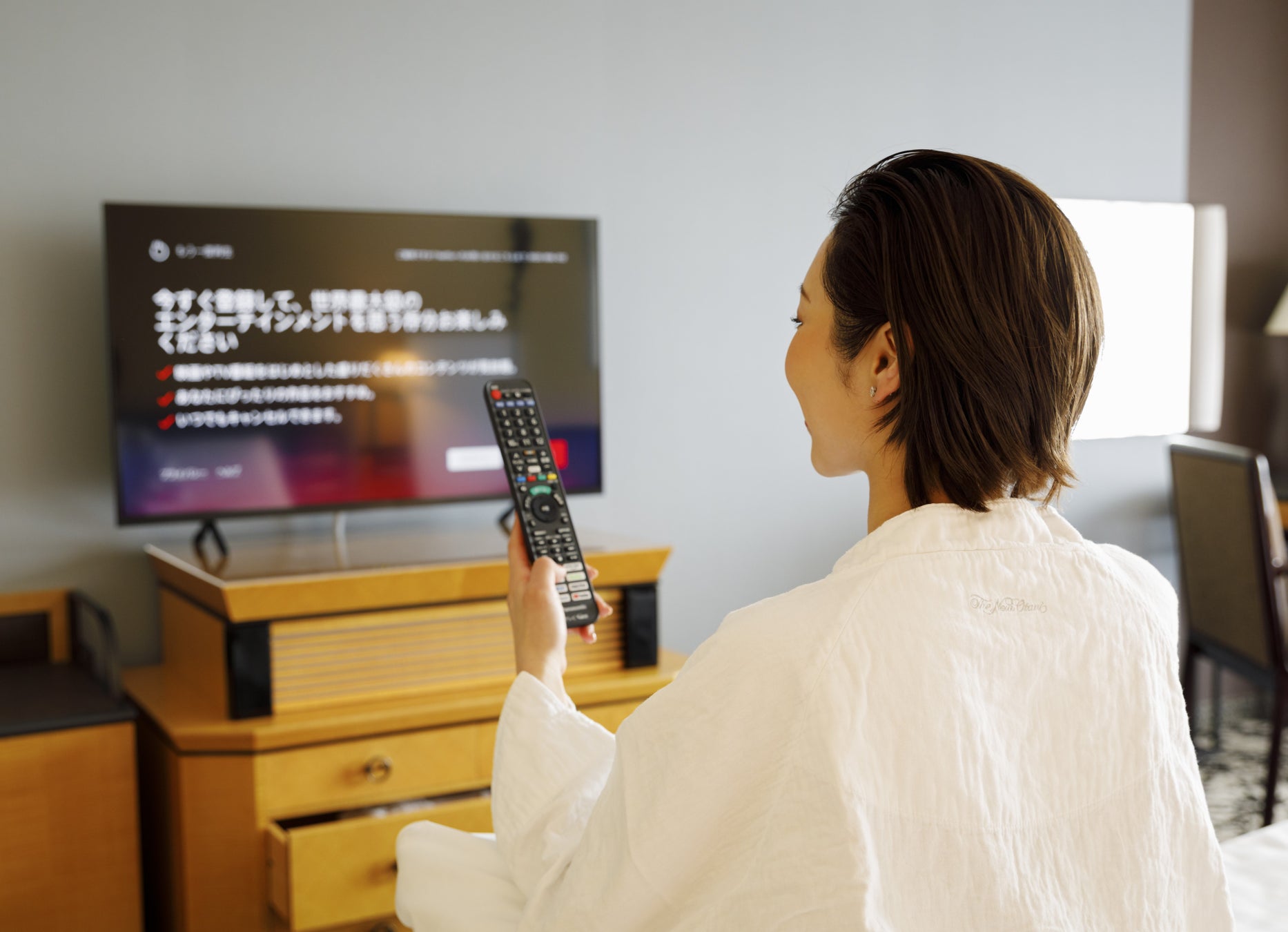 全客室に導入したスマートテレビは、4K動画配信サービスを利用することで、すぐに、美しい映像をお愉しみいただけます。これまでは、ご自身のスマートフォンやタブレットで視聴していた動画を、お部屋でゆったりとご覧いただくことが可能になりました。