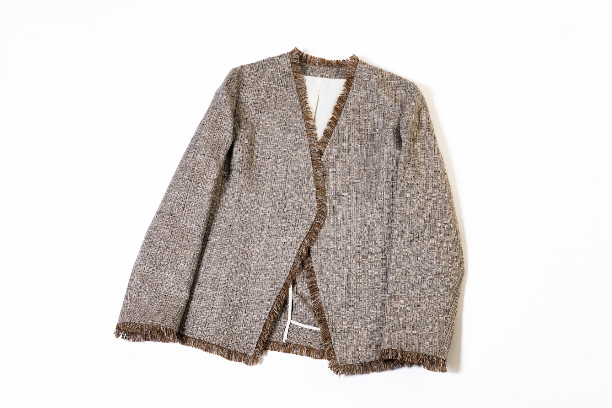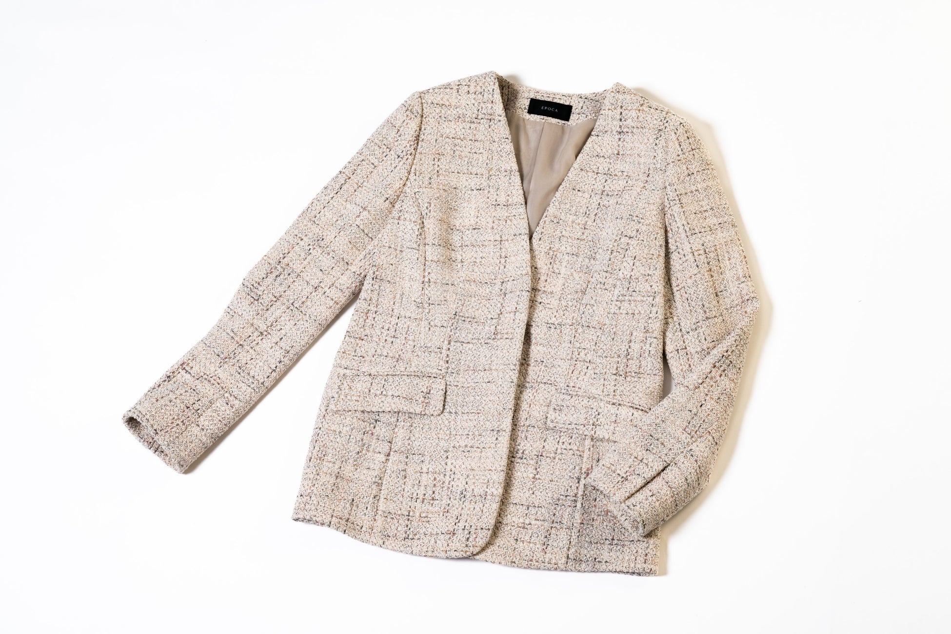 ファンシーツイードの豊かな表情が魅力のジャケット。生地はイタリア製で、かすり染めによるカラフルな糸で織ることで春らしい軽やかな彩を生み出しています。ジャケットらしいきちんと感はありながら、硬い雰囲気にならないよう着丈を長めにすることで、品格ある佇まいを醸し出すように仕上げています。