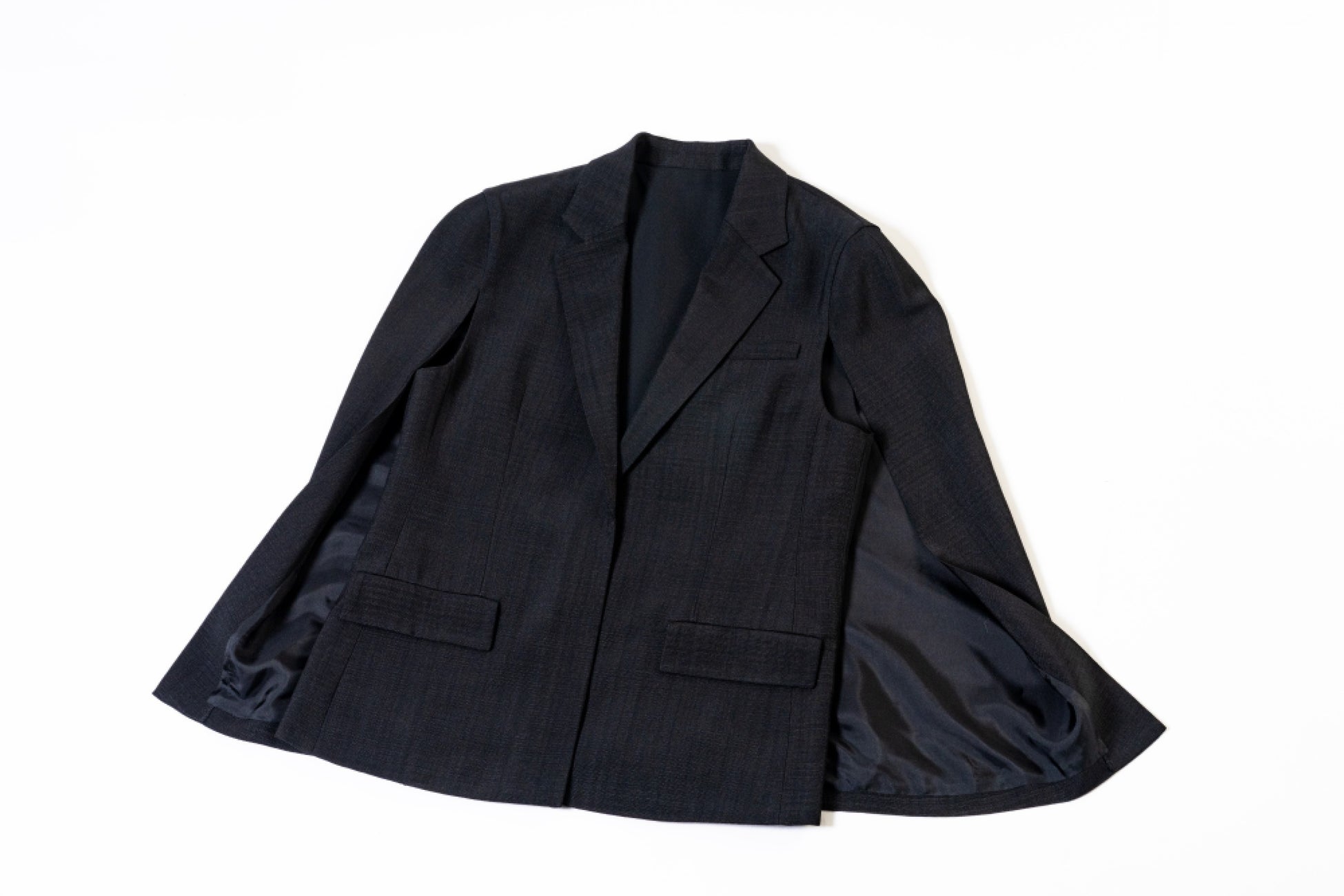 レーヨン100%の軽やかな着心地と、梳毛のようなつややかな表情を持つジャケットは、ケープスリーブとコンパクトな着丈、ノーボタンのミニマムデザインでクールに表現しています。イタリア・テックスモーダ社の上質素材を使い、<バジーレ28>のこだわりが詰まったテーラリングで仕上げています。