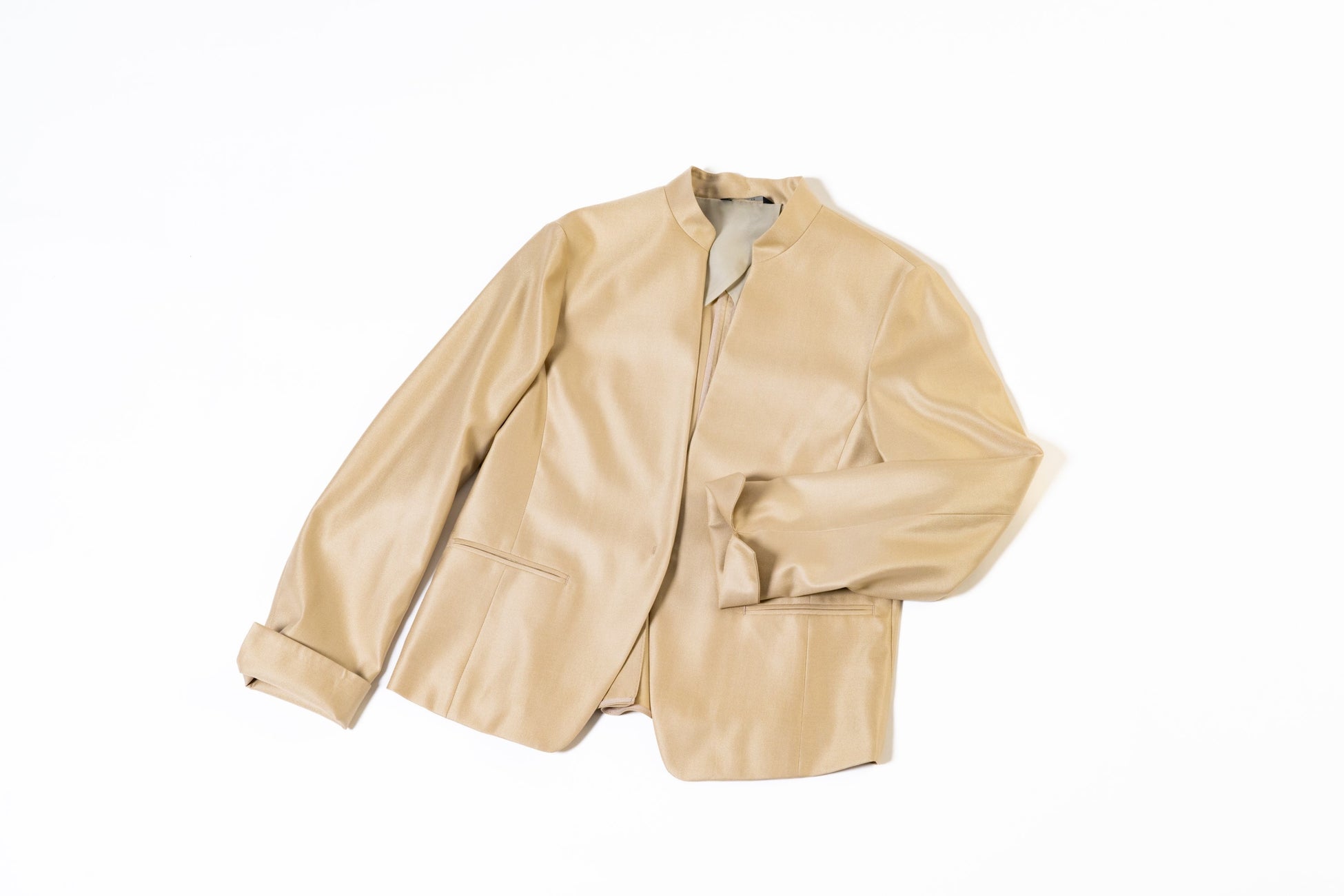 ボット・ジュゼッペの生地を使ったノーカラージャケット。春らしい色味を使った生地からは春の訪れを感じさせます。すっきりとしたミニマルな印象で、適度に絞ったウエストのシルエットと後タックで女性らしさを強調。キリっとしたカッティングとちび衿で甘すぎないジャケットです。