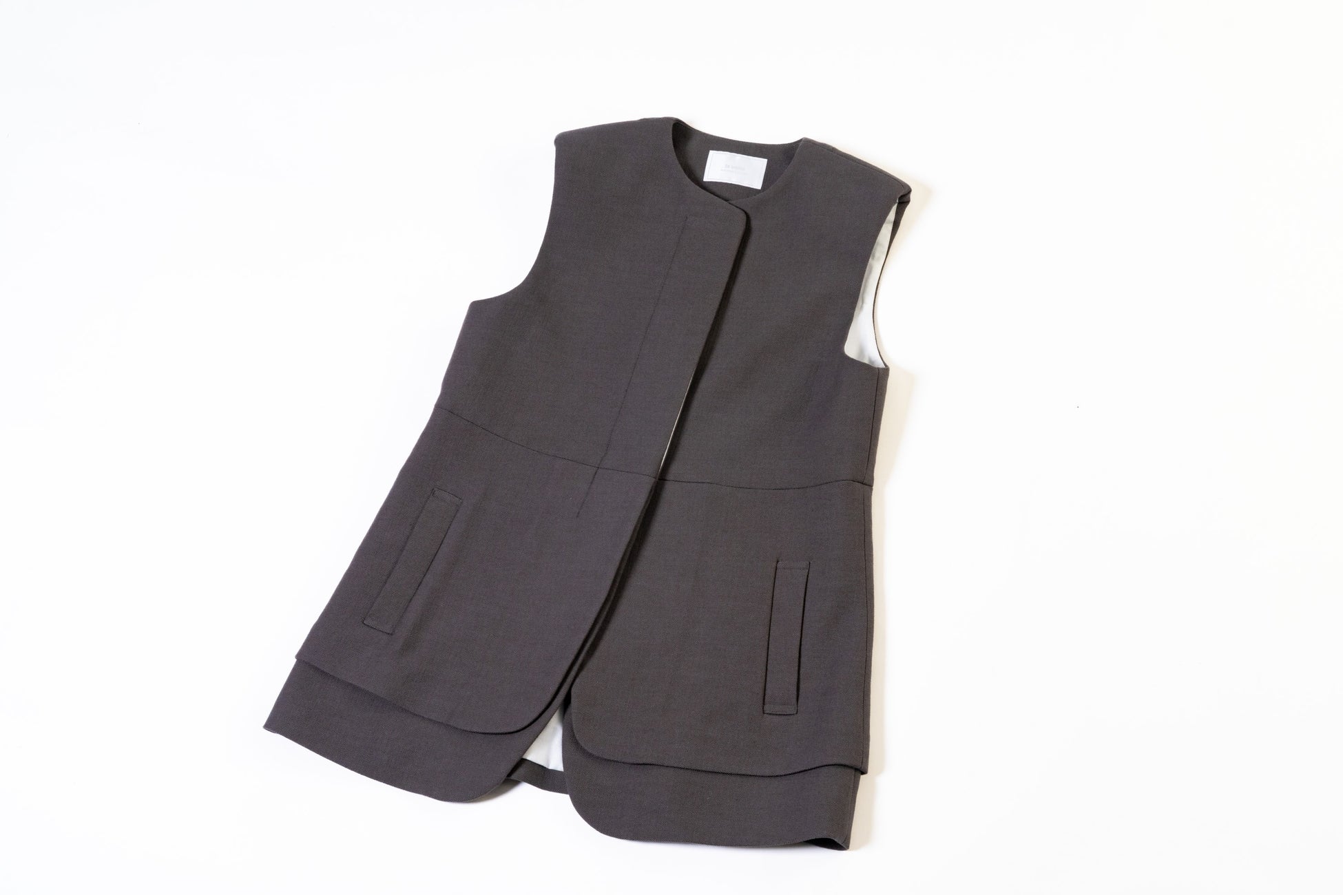<スーペリアクローゼット>の新レーベルで、クリエイティブディレクター英里・リストリ氏がパリでの生活の中で感じるクリエイティブディレクター英里・リストリ氏がパリでの生活の中で感じる古き良きものと現代の共存、そして日本のものづくりへのこだわりや職人技術の高さを独自の感性でフュージョンする<ラヴェイユ バイ スーペリアクローゼット>。新作のジレはパットを入れることによってシャープな肩のラインを強調しつつも、それとは対照的な丸みをもたせた裾ディテールが「女性の強さとしなやかさ」の共存を表現した一着。