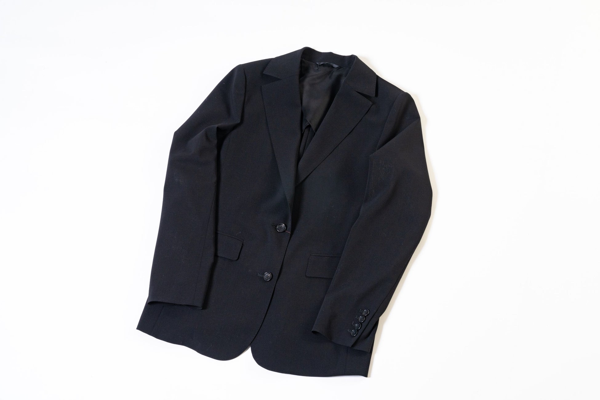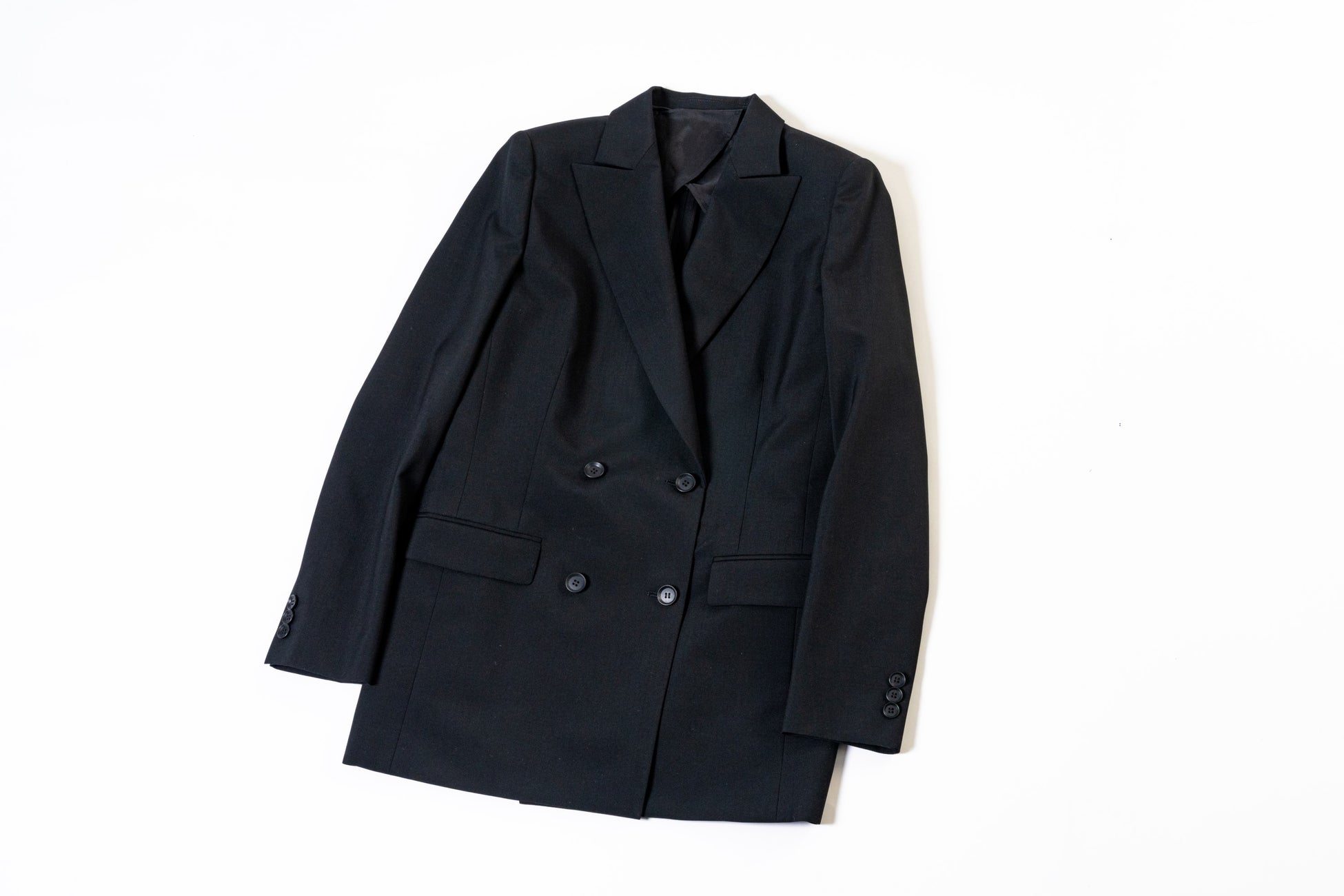 イタリアのコロンボ社にて開発された素材はタテ糸・ヨコ糸に細番手の梳毛ウールを規格密度良く平二重織の組織で織上げています。ベーシックな無地素材でありながら、ウール原料の持つ光沢感を最大限に引き出し、高級感溢れる素材に仕上げています。大き目の襟と前振りの袖がマニッシュなジャケットは、程よく身体から離れたシルエットで優雅な印象です。ハンドステッチを利かせ、本水牛釦を使用したスペシャルなジャケットです。