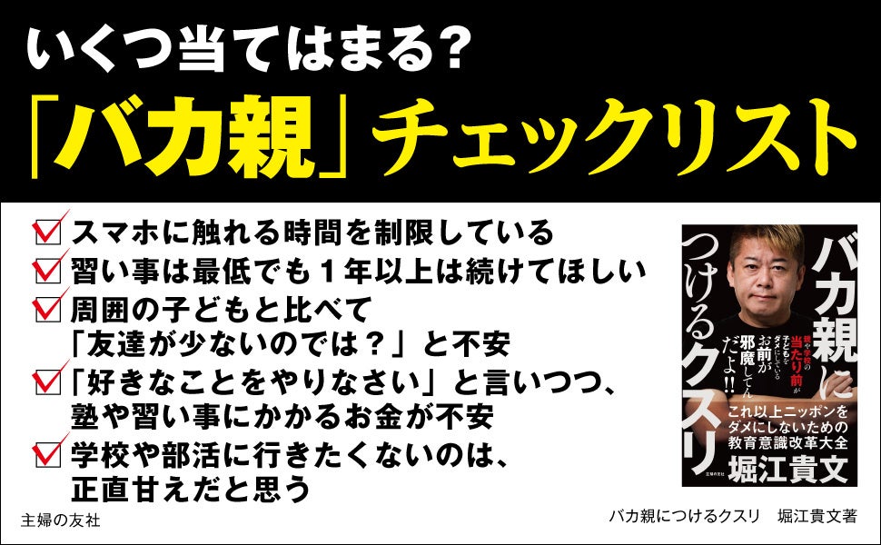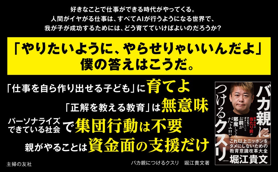 株式会社主婦の友社は、教育の常識を根底から覆す問題作、実業家・堀江貴文さんよる『バカ親につけるクスリ』(https://www.amazon.co.jp/dp/4074612968)を2025年7月31日(木)に緊急出版いたします。
