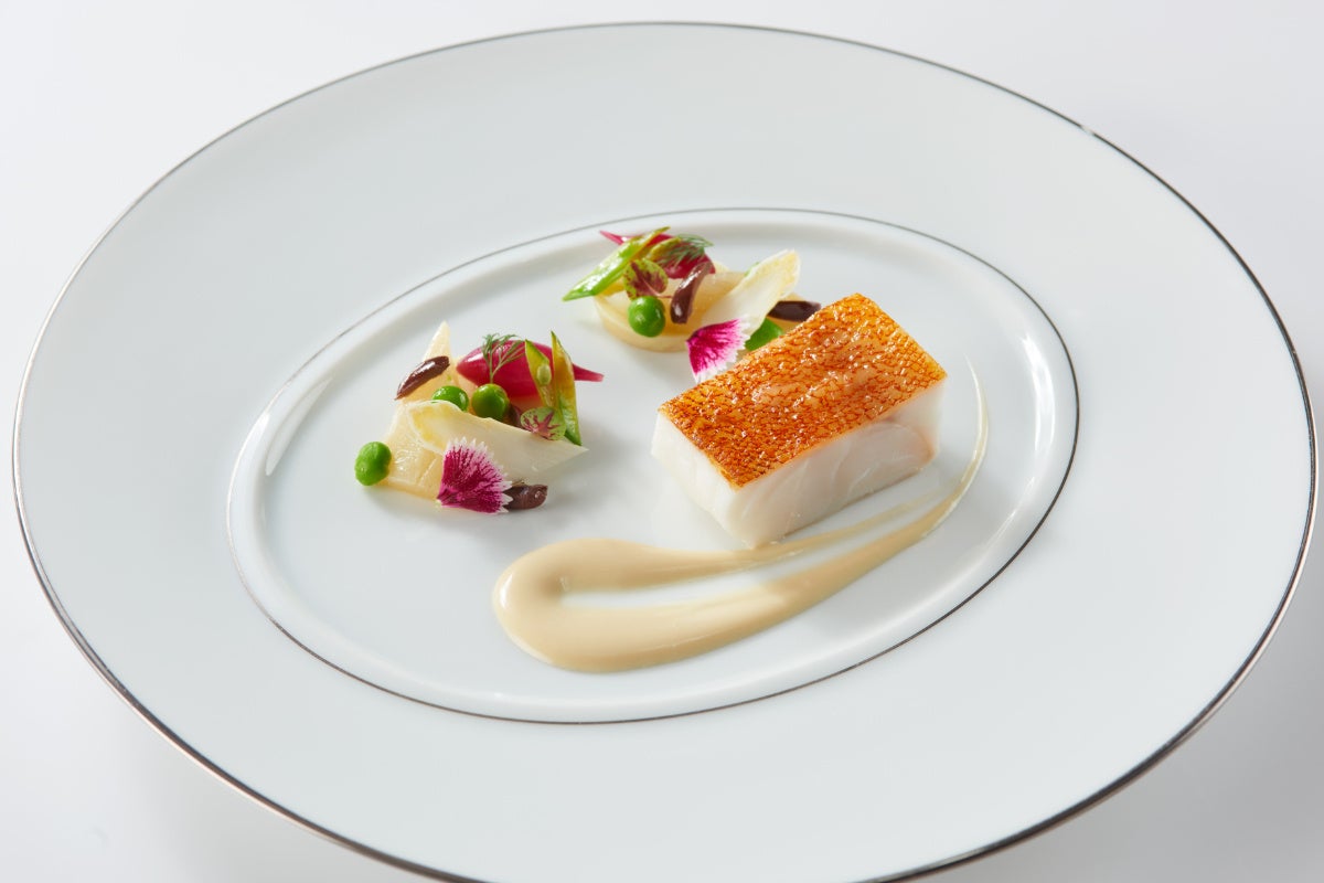 旨味を閉じ込めたハタのポワレに優美なホワイトアスパラガスのソースを合わせ、爽やかなレモンの香りを纏わせたフヌイユと新ジャガイモのコンフィをあしらいました。