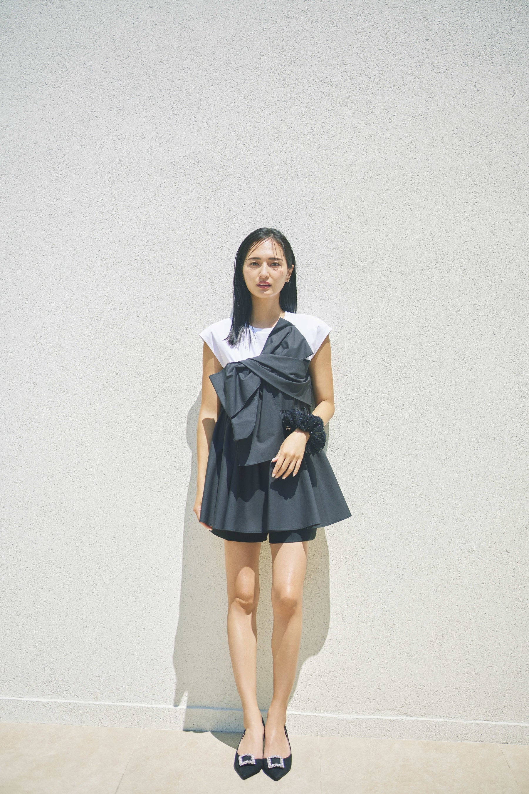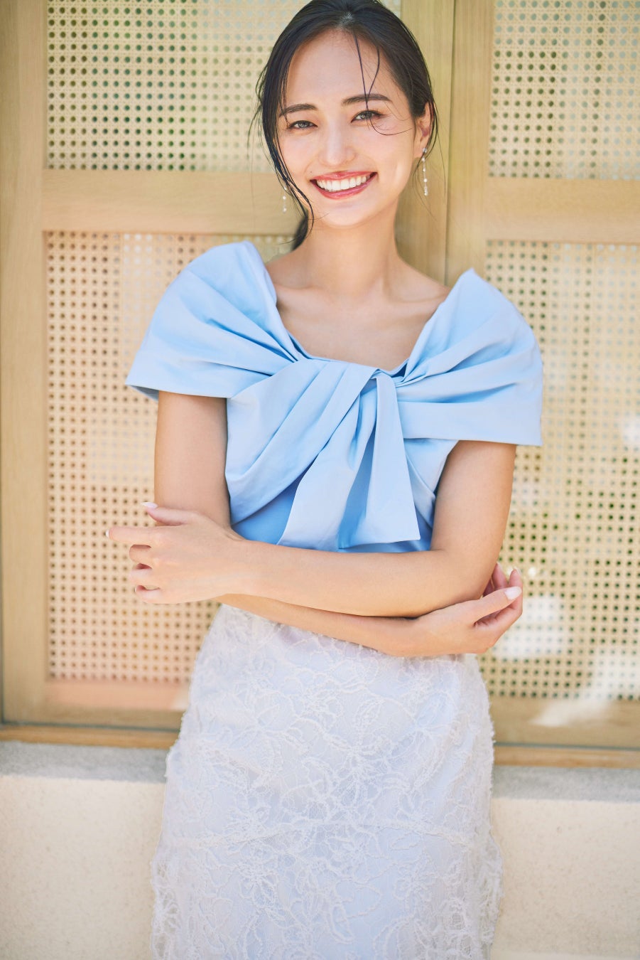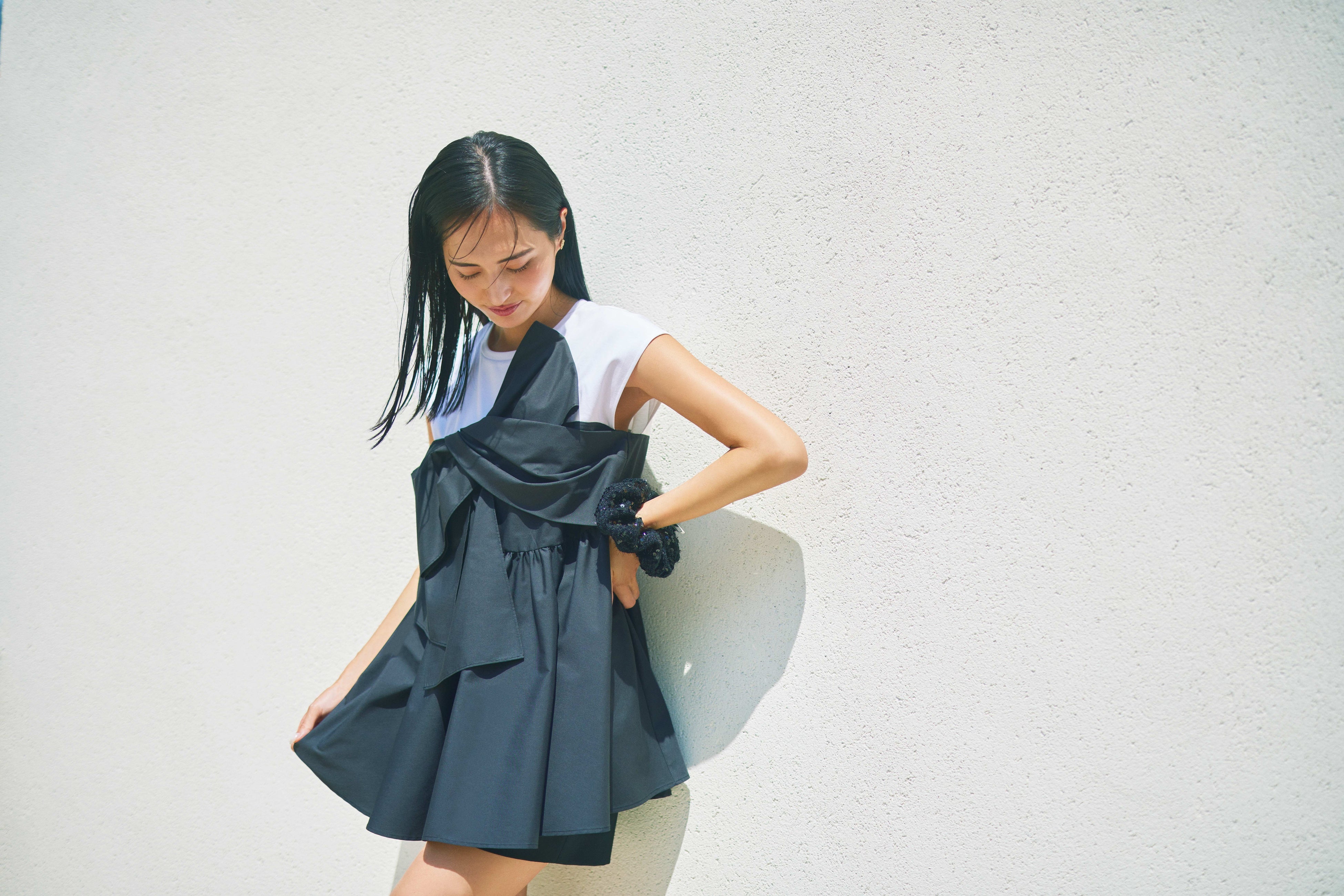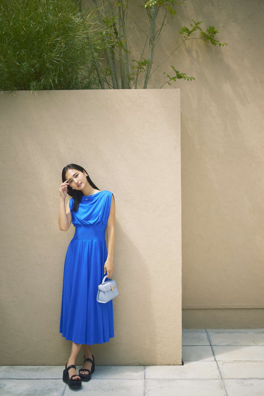 プライベートはシンプルスタイルが多くて、白・黒・ネイビーの出番が圧倒的。今回の撮影で、自分ではなかなか選ばないロイヤルブルーのワンピースや淡いピンクのパンツを