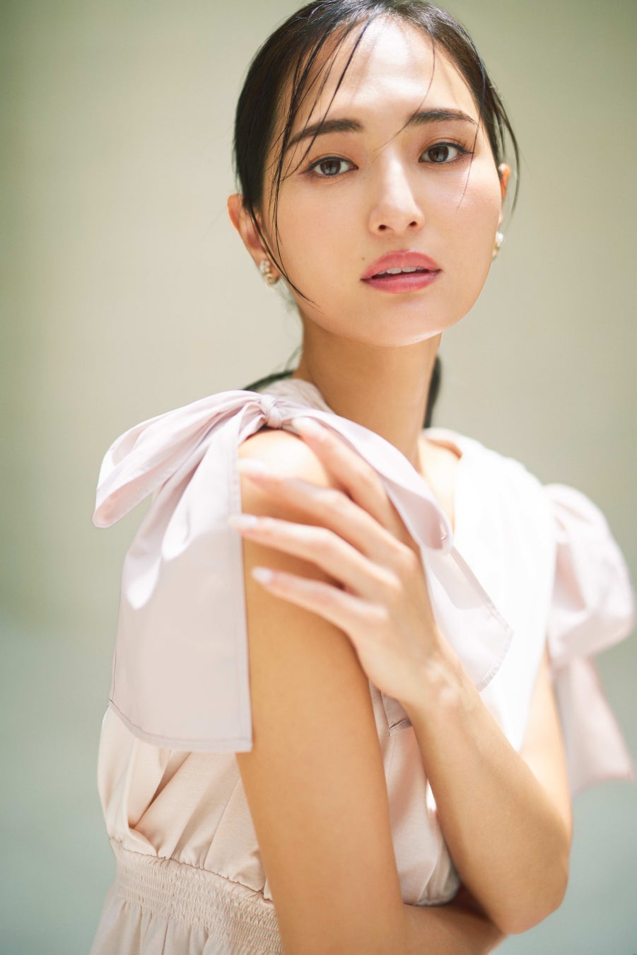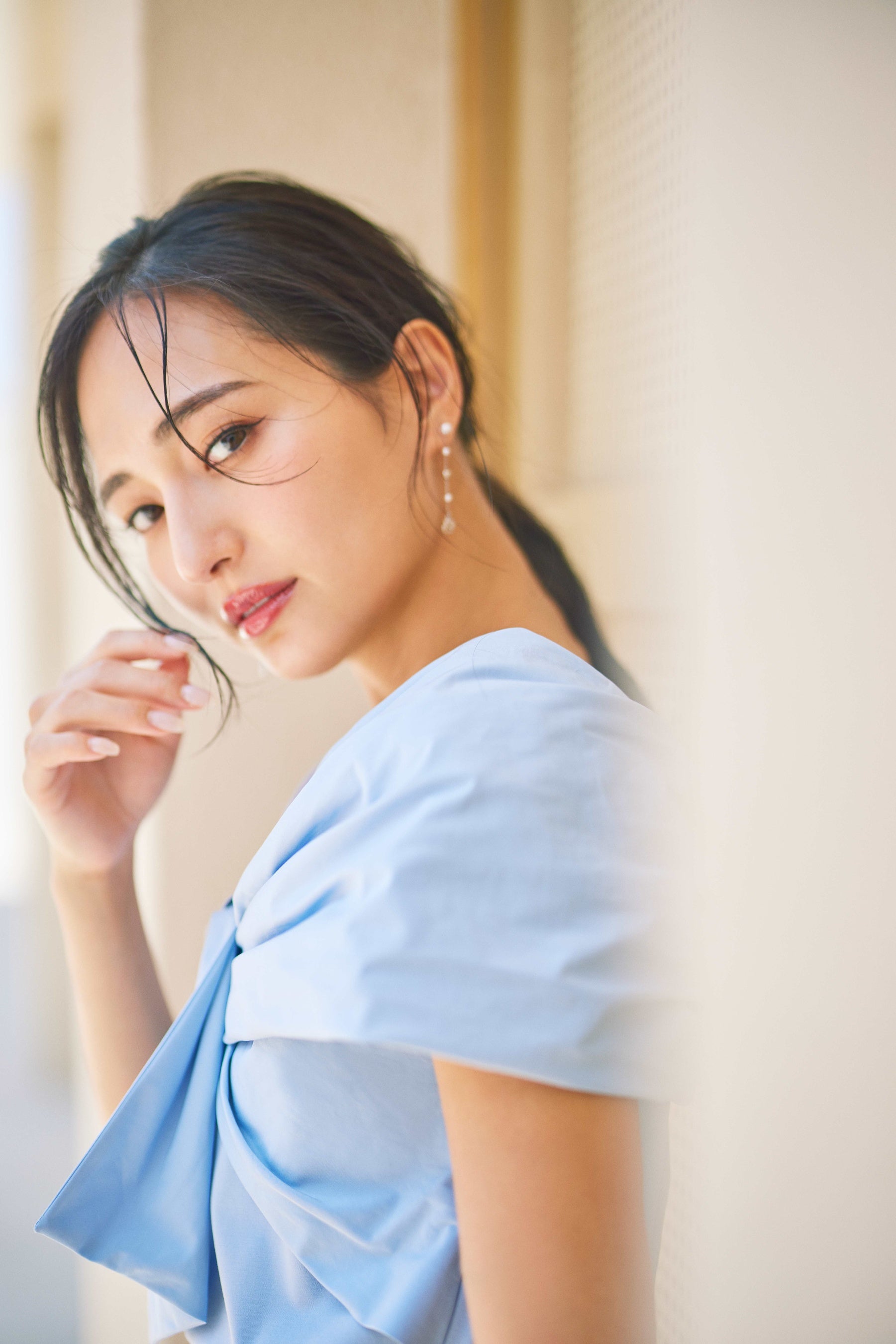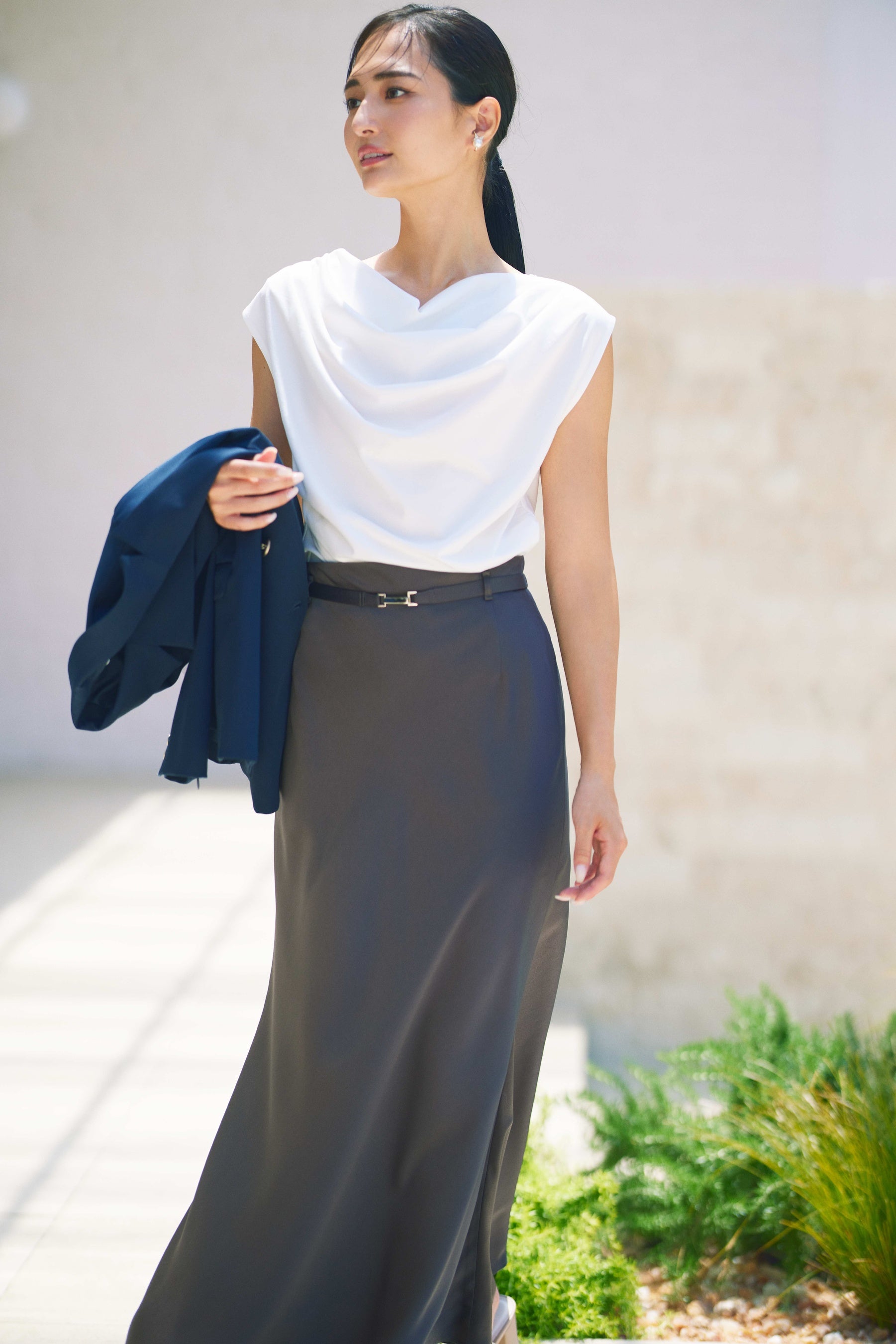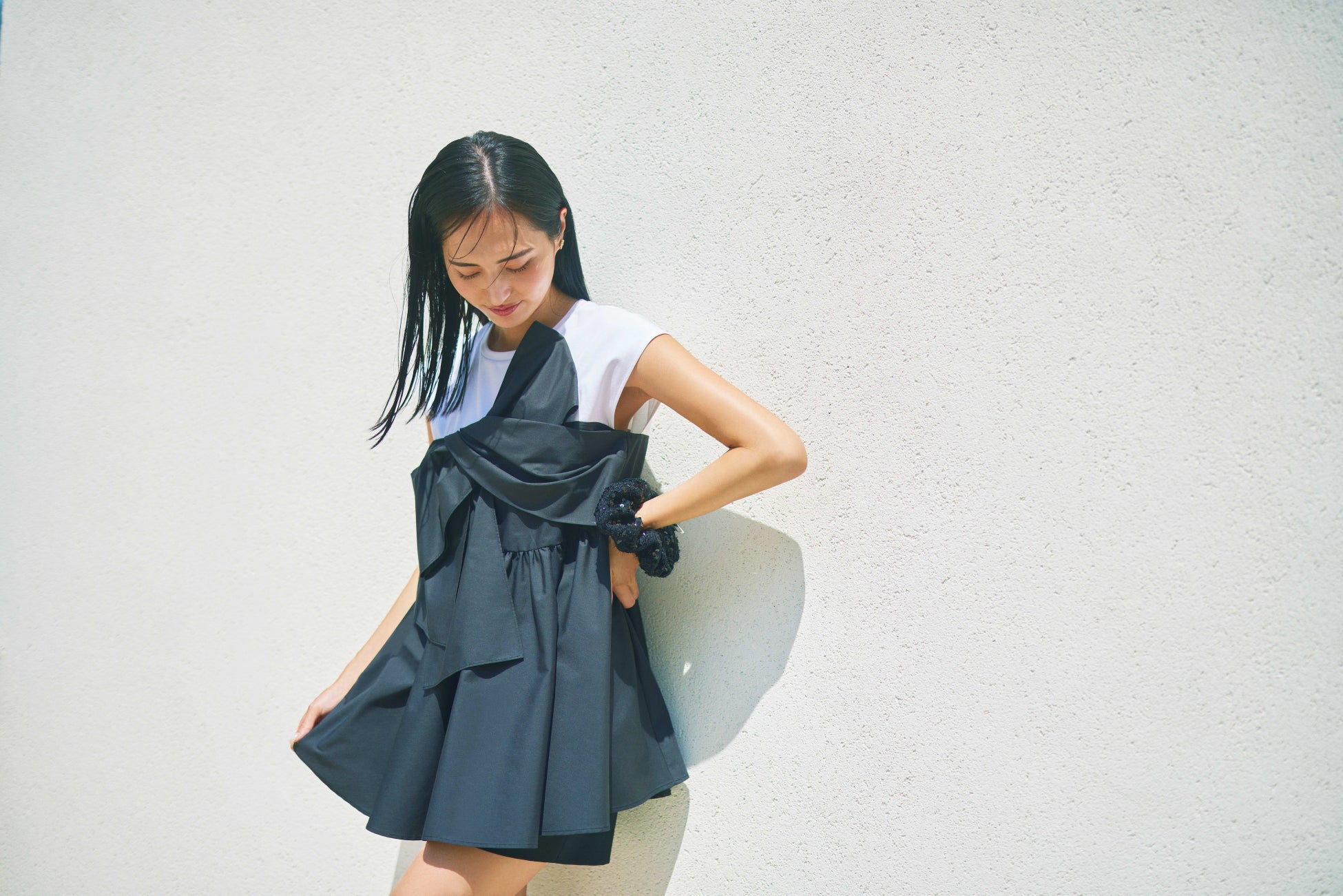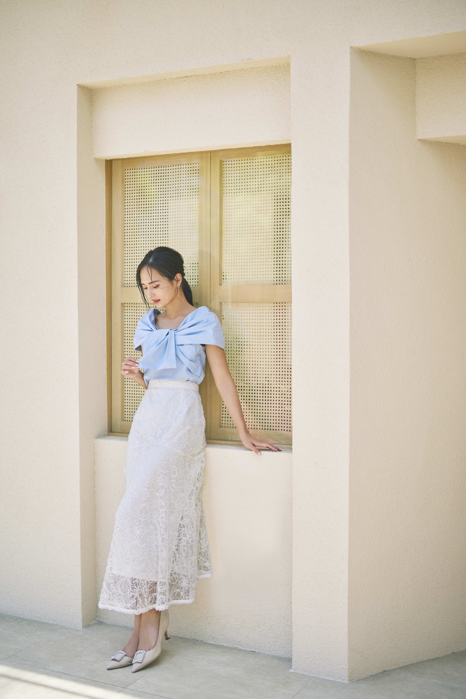 プライベートはシンプルスタイルが多くて、白・黒・ネイビーの出番が圧倒的。今回の撮影で、自分ではなかなか選ばないロイヤルブルーのワンピースや淡いピンクのパンツを