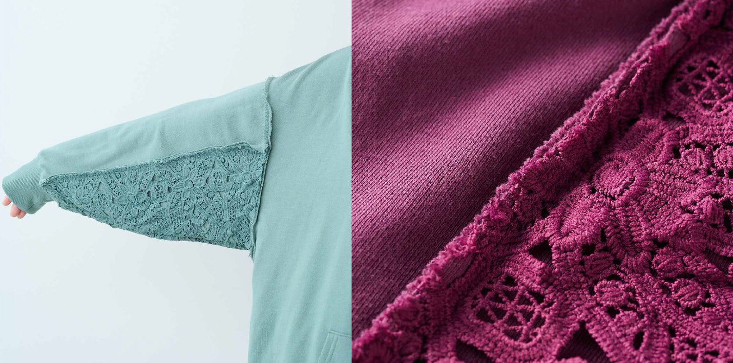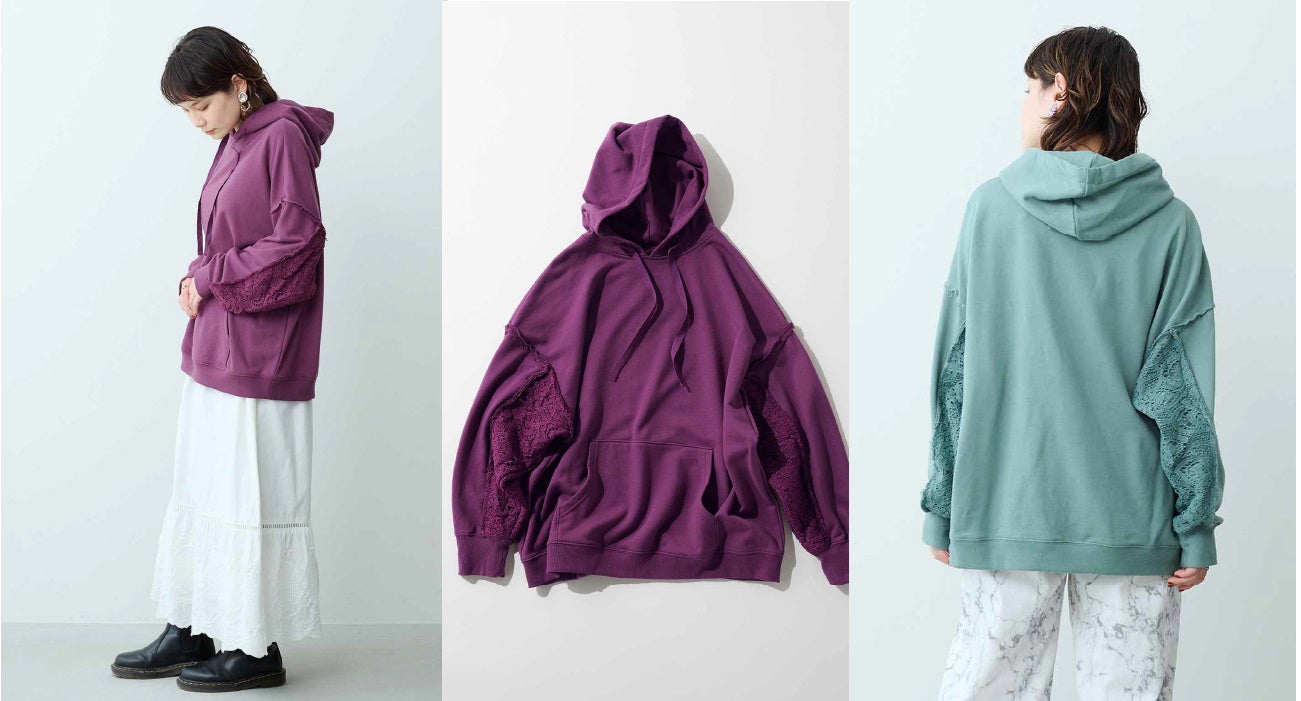 袖下部分にレースを配した、クラフト感のあるデザインのフーディーです。ゆったり丸みのあるフォルムと、肩を落としたシルエット、切りっぱなしの端始末でラフな雰囲気です。
