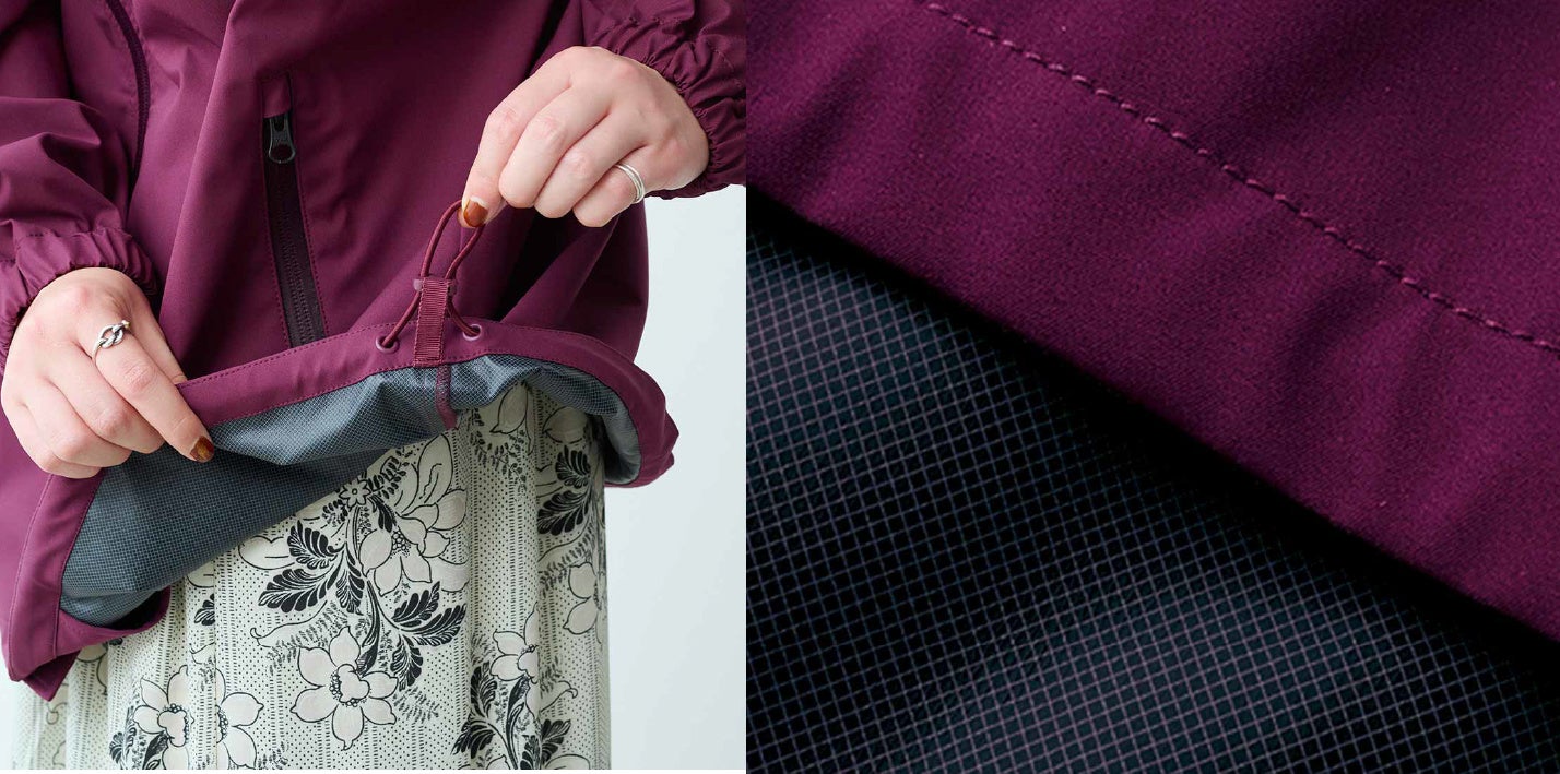 二層の生地に、さらにコーティングをほどこした「2.5レイヤー」の素材は、防水性も軽さも備えています。