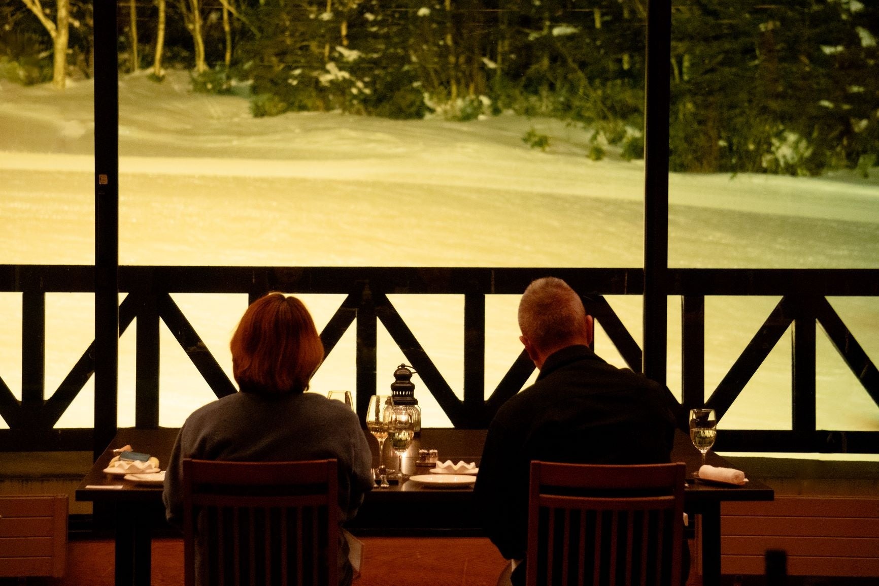 ホテルの入口には専属のバトラーがお出迎え、そのままスイートルームでチェックイン。お部屋の窓から夕暮れのマジックアワーを眺め、やすらぎの時間を。夕食は特別に用意した個室へ、明日の滑る山々が窓の外に広がり、翌日のイメージを膨らませることができる特別なコース料理に舌鼓。マットレスの「Air」(西川㈱製)で身体を整え翌日に備える。