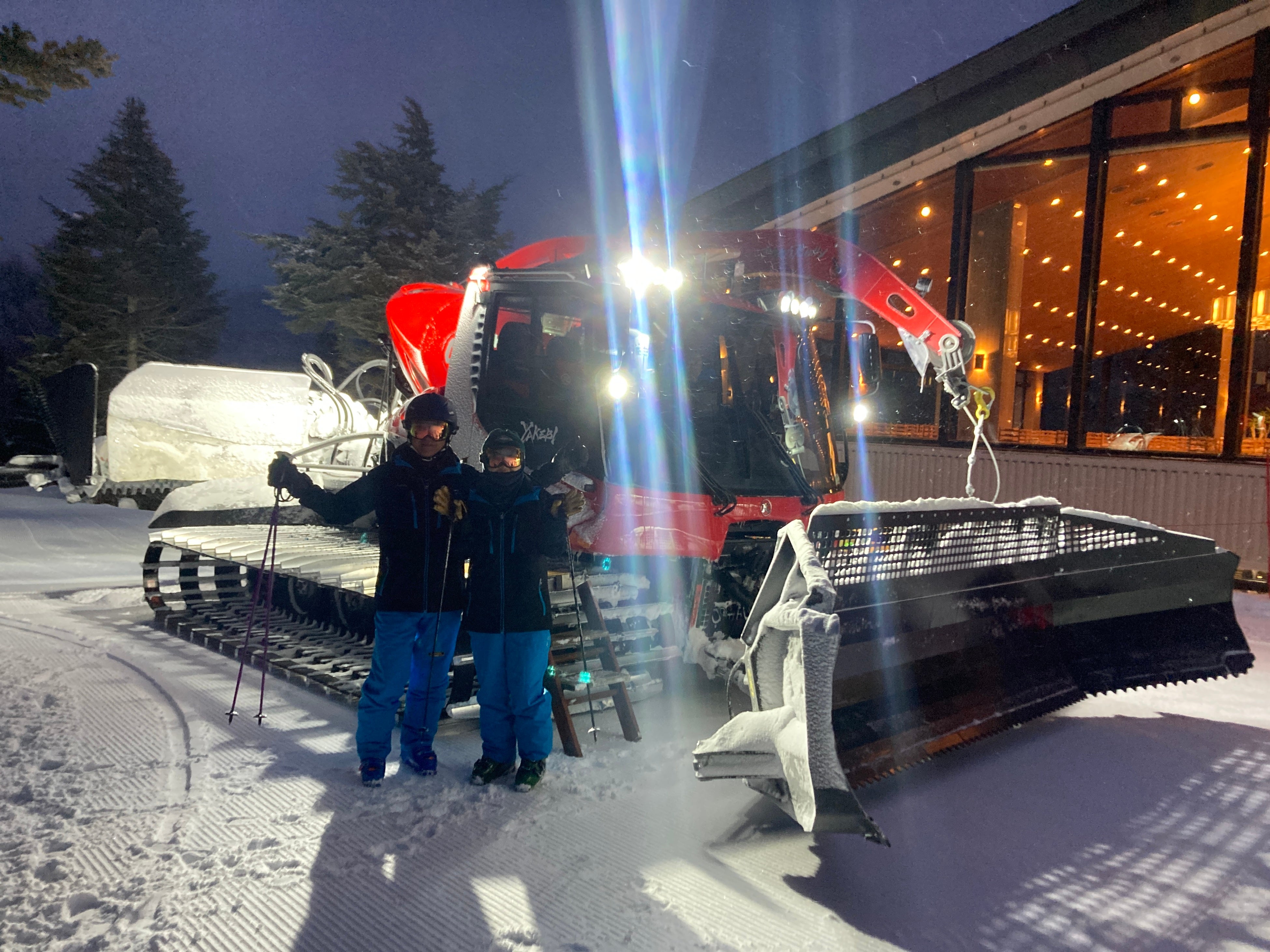 ・翌朝はスタッフが運転する圧雪車に同乗してゲレンデ山頂を目指し、モーニングコーヒーを召上がり
