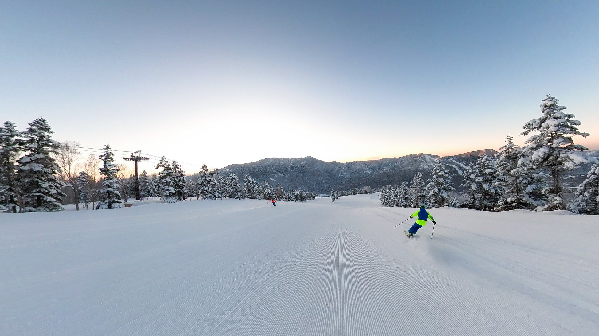 ・整備したての誰も滑っていないゲレンデで、思い思いのシュプールを描く。その様子は専属カメラマ