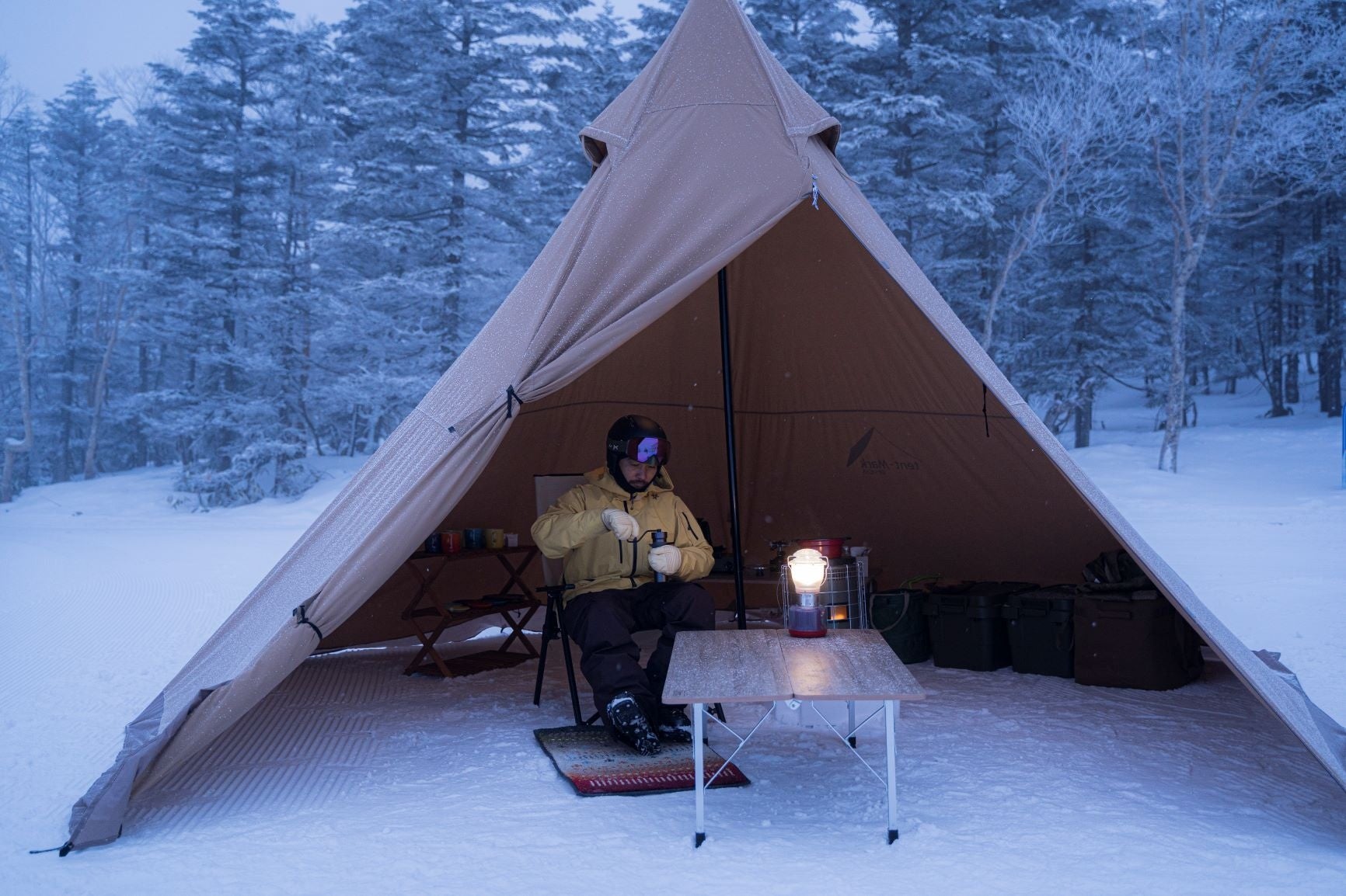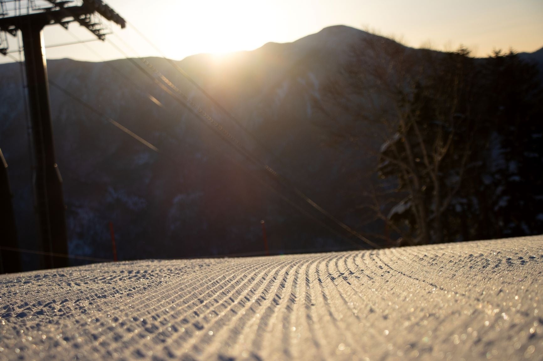 日が変わり太陽が上がる前に圧雪車へ乗り、自然の地形を活かしたコースを上っていく。山頂に特別なテントを準備、一流のミルと色とりどりなカップが並び、モーニングコーヒーをいただく。正面の山は黄金色に色づき、北アルプスはオレンジ色に輝く、朝日へと移り行く空の色変化を眺め、焼額山の最高の雪質に板を置きスタートを待ち望む。パトロール隊員の無線に「OK」という言葉でスタートする。風を切る音に雪が舞い、誰もいないゲレンデに自分だけのシュプールを描いていく。