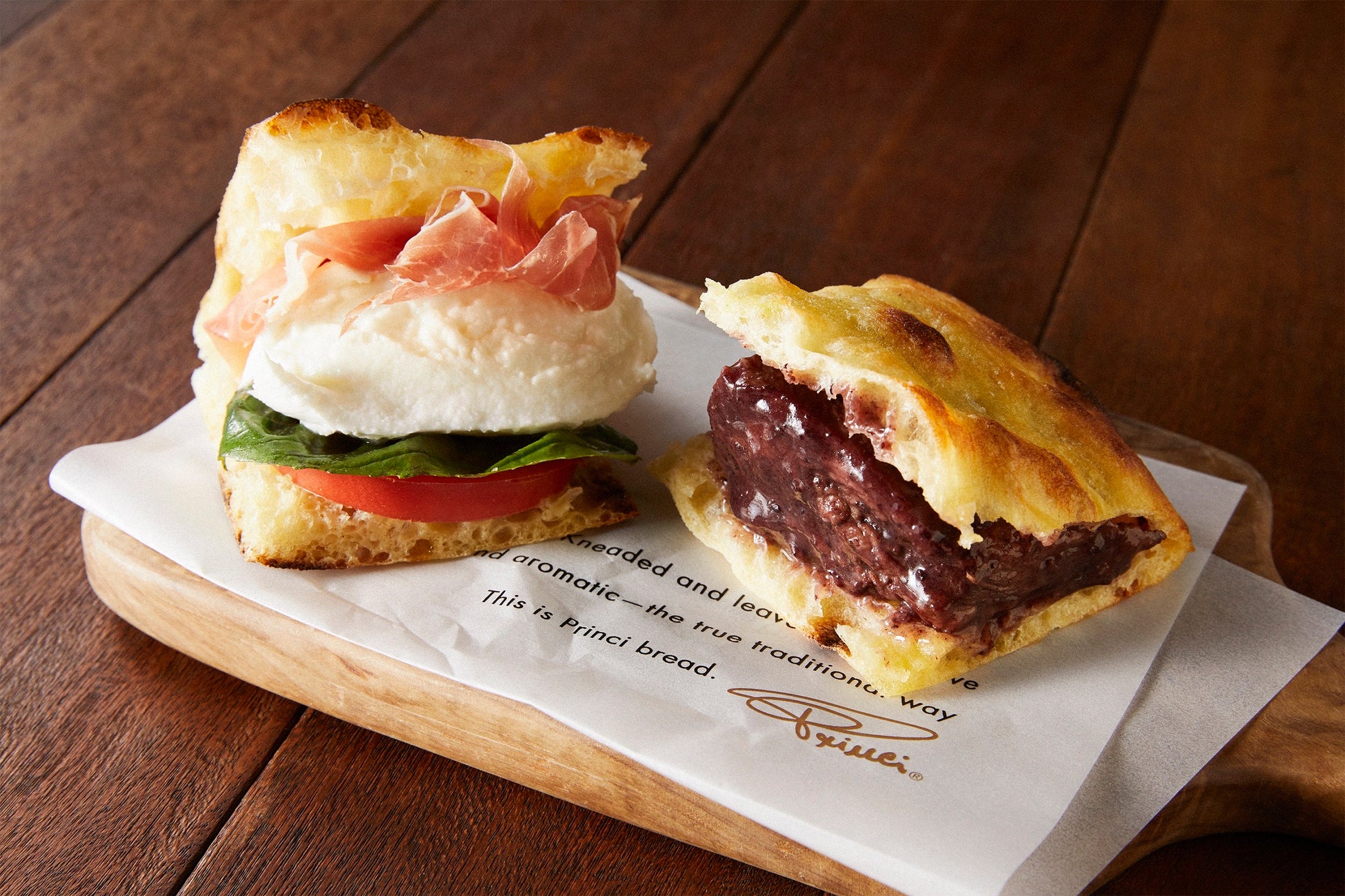 「ビーフ ヴィノロッソ」はやわらかな肉質の牛肉を赤ワインでじっくり煮込み、凝縮された旨みをまるごと味わえるサンド。口の中でほどけるような食感、濃密な味わいを堪能ください。「スペチァーレ カプレーゼ」はイタリア職人が作り上げたミルクの旨味が溢れるモッツァレラチーズを主役に、みずみずしいフルーツトマト、バジルでカプレーゼを仕立て、熟成された生ハムとともに挟み込みました。