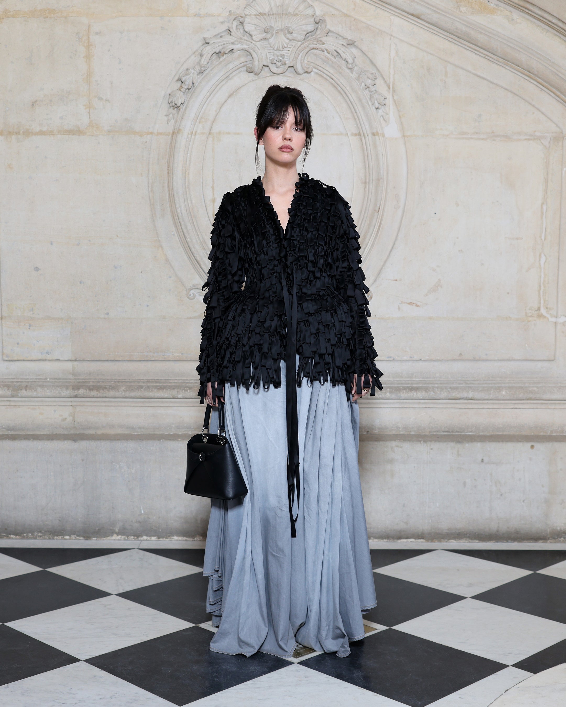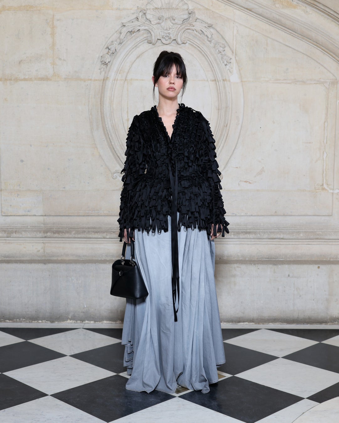 ミア・ゴスはブラックウールのジャケットとグレーのシルクパンツのルックに、ディオールのアクセサリーを合わせました。