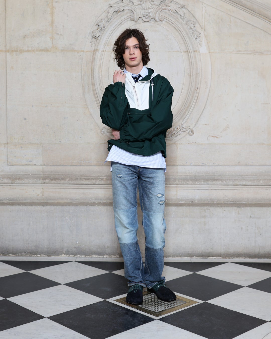 ポール・キルヒャーはディオールのグリーンレインコートと、ブルーストライプコットンシャツ、ブルーデニムジーンズを着用しました。ディオールのアクセサリーも身につけました。