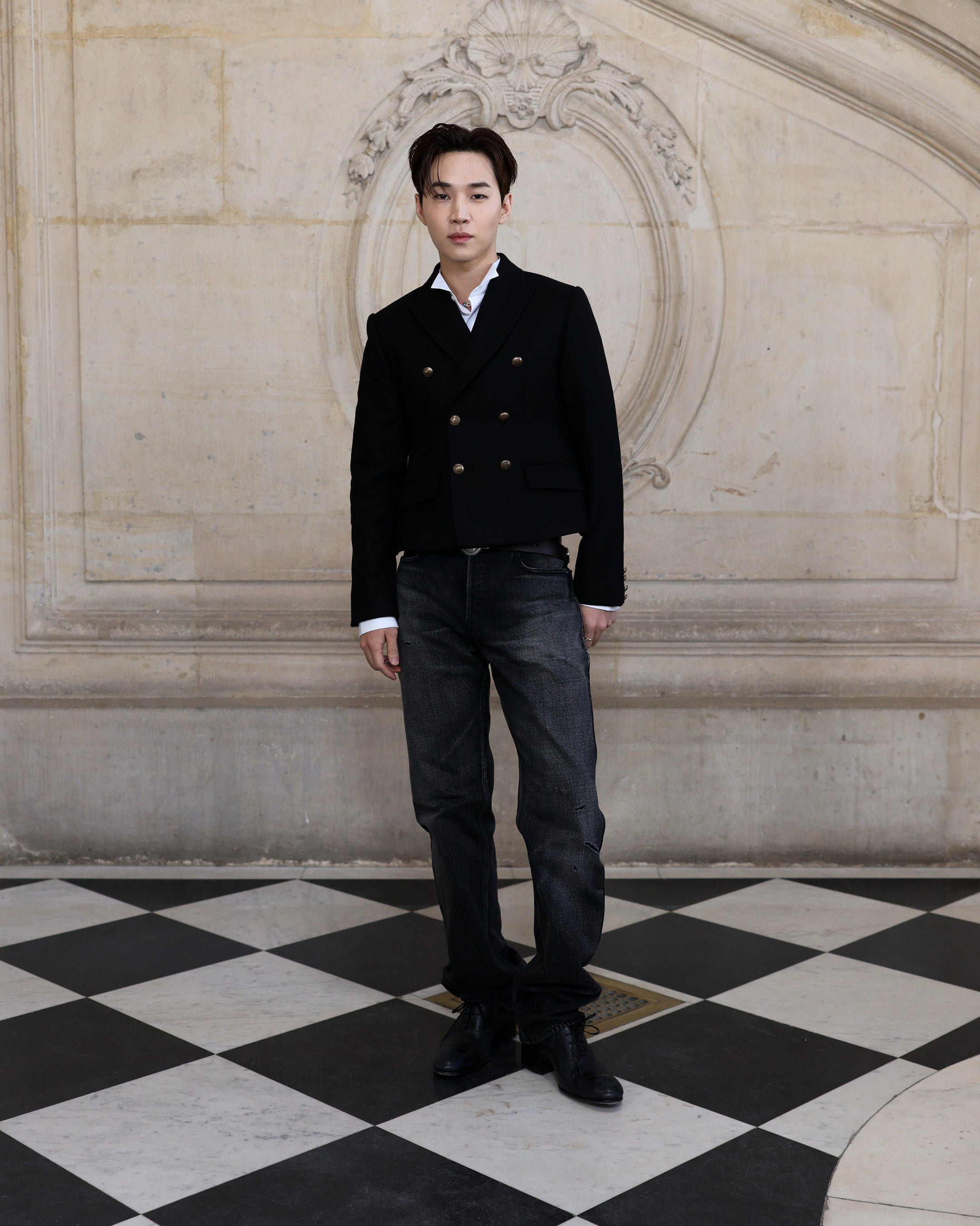 ヘンリー・ラウはブラックウールの「バー」ジャケット、ホワイトコットンのウィングチップカラーシャツ、ブラックのデニムジーンズを纏いました。ディオールのアクセサリーも着用しました。