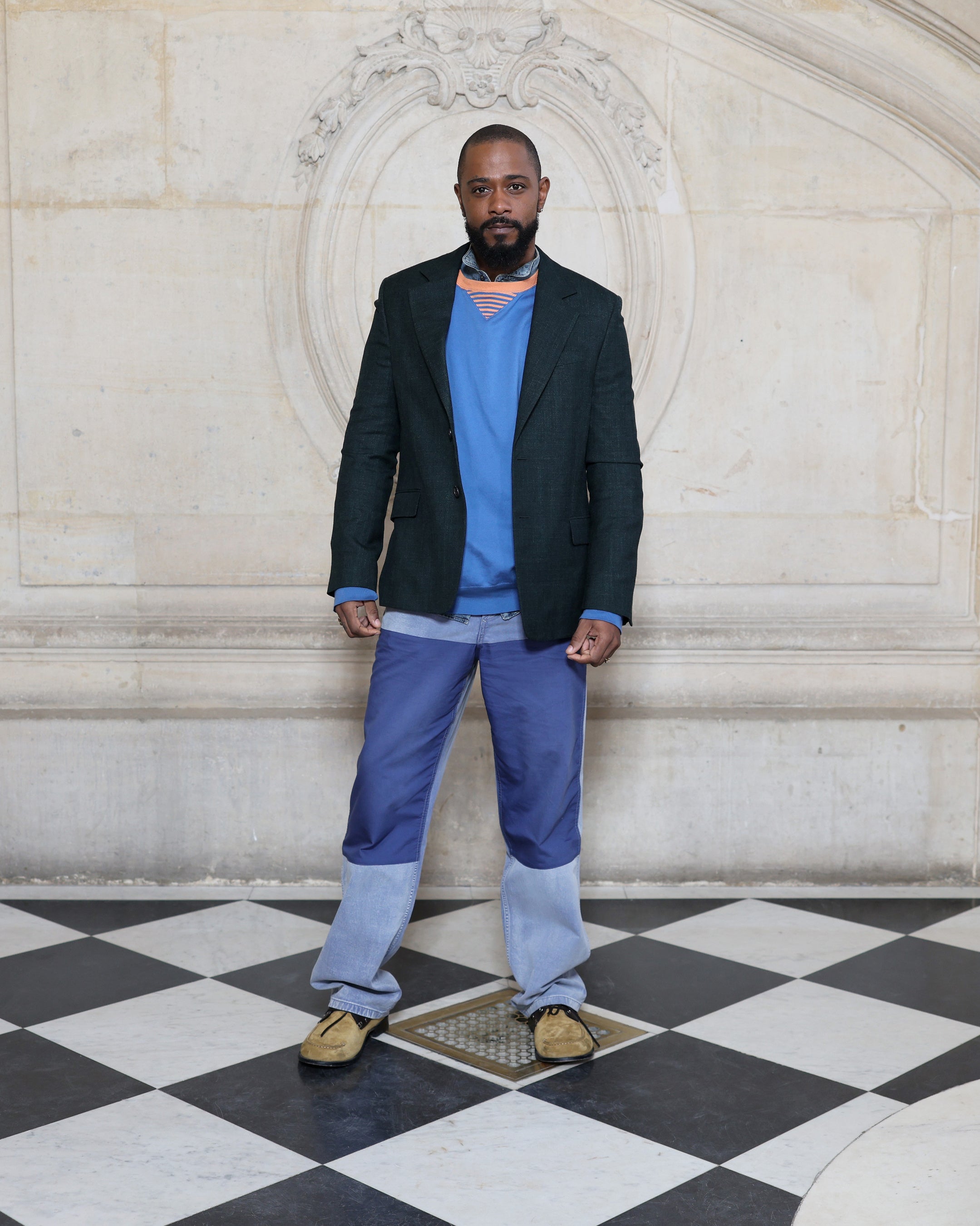 ラキース・スタンフィールドはダークグレーウールのノッチドラペルジャケットと、ブルーのジャージープルオーバー、ブルーのコットンパンツを着用しました。ディオールのアクセサリーも身につけました。