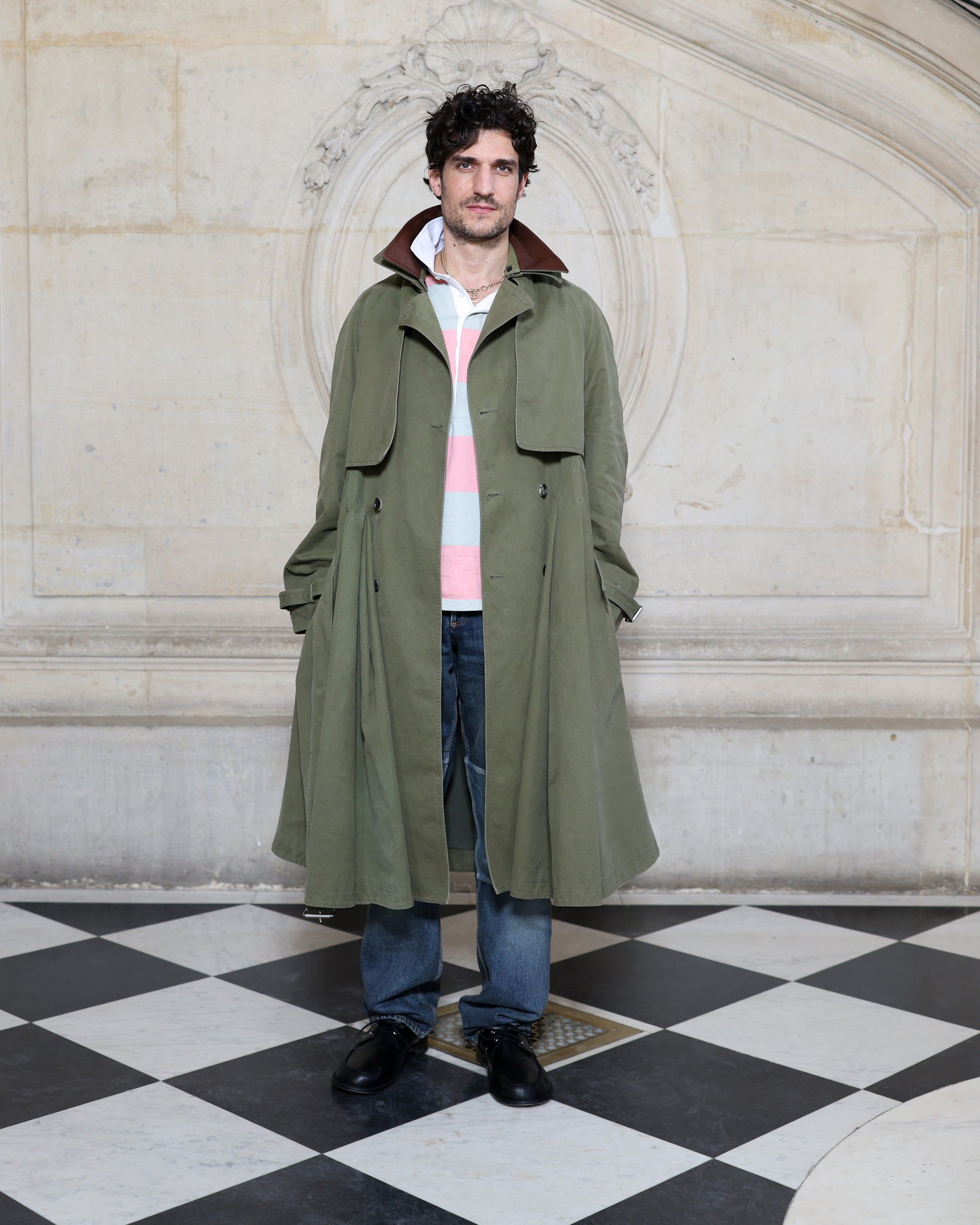 ルイ・ガレルは、カーキのコットンプリーツトレンチコートと、グレーとピンクのジャージーポロシャツ、ブルーのデニムジーンズを纏いました。ディオールのアクセサリーも着用しました。