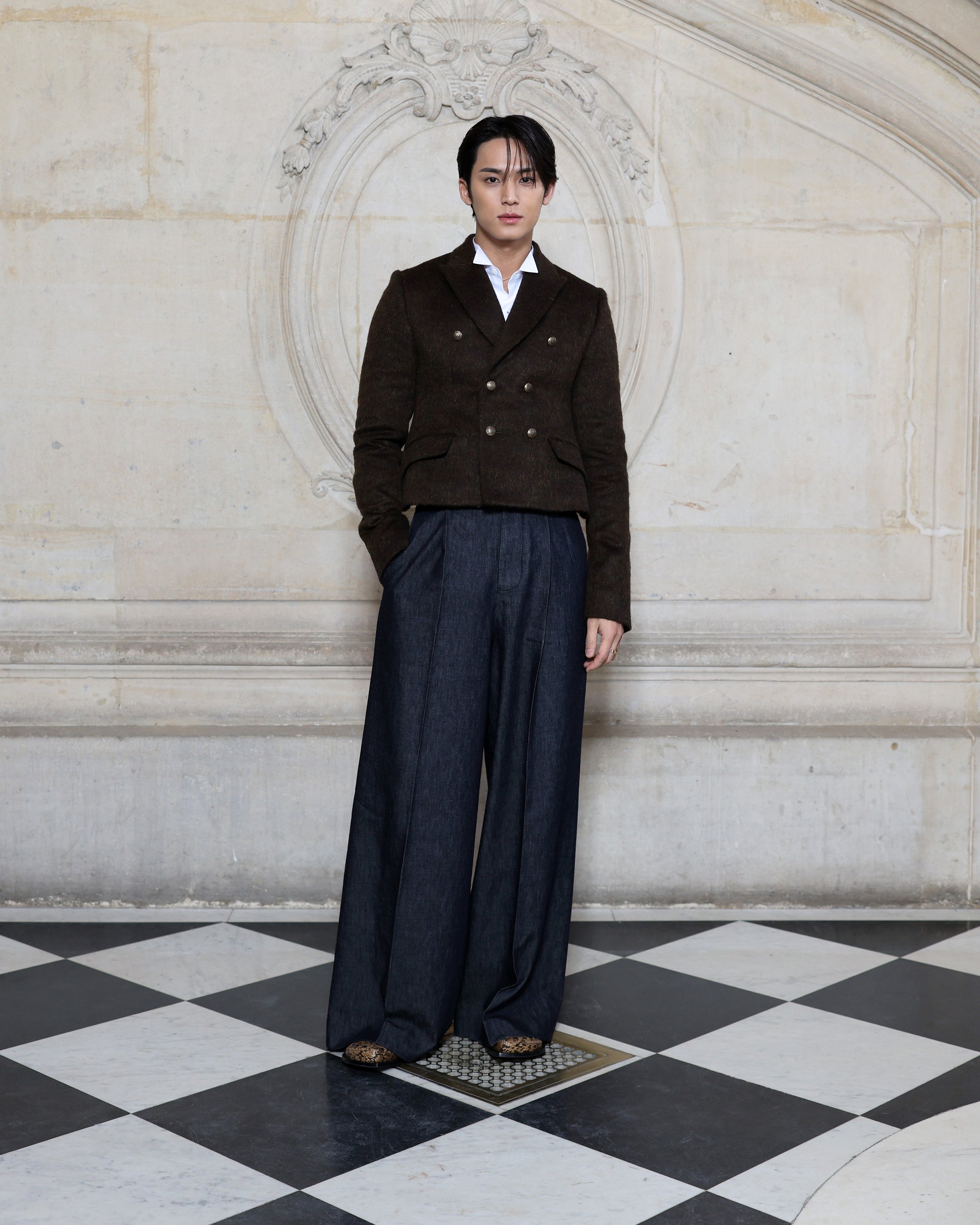 ミンギュは、ブラウンウールの「バー」ジャケットに、ホワイトコットンのウィングチップカラーシャツ、ネイビーのウールパンツを合わせた装いで登場しました。ディオールのアクセサリーも着用しました。
