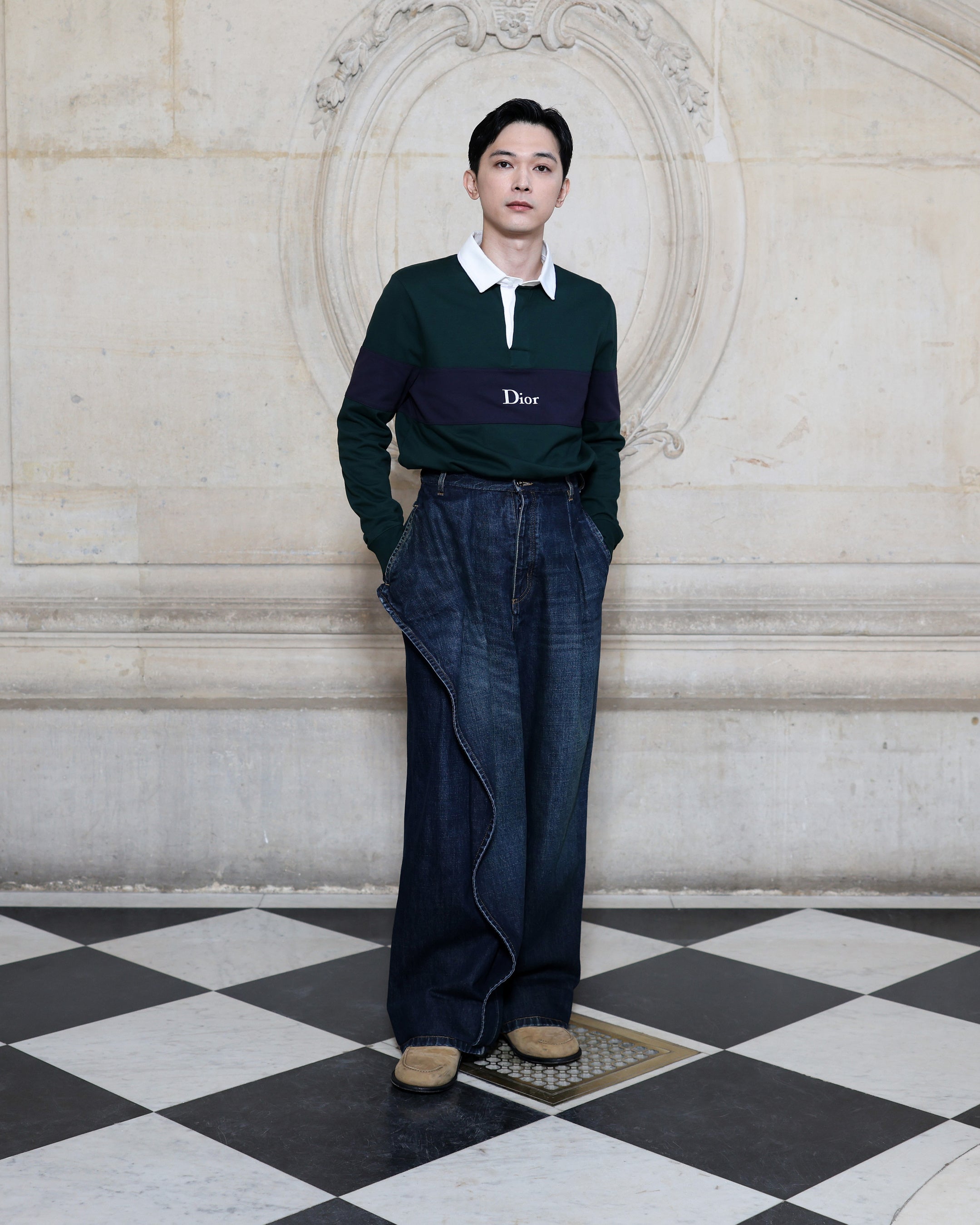 吉沢亮はグリーンとネイビーのジャージーポロシャツに、ダークブルーデニムの「カプリス」ジーンズを合わせ、ディオールのアクセサリーも着用しました。
