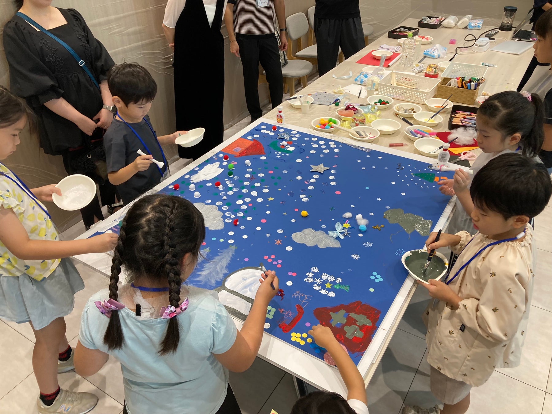 9月からスタートしたこのプロジェクト。阪急うめだ本店のシンボルとも言えるコンコースウィンドーを手掛けるデザイナーと一緒にクリスマスのイメージを話し合い、絵の具やリボンテープを使ってフォトスポットの背景パネル作りを行いました。さらに、メインであるスノードームのデザインをこどもたちが考案。集まったみんなの原画を元に、デザイナーが背景パネルと組み合わせて制作し、完成させました。