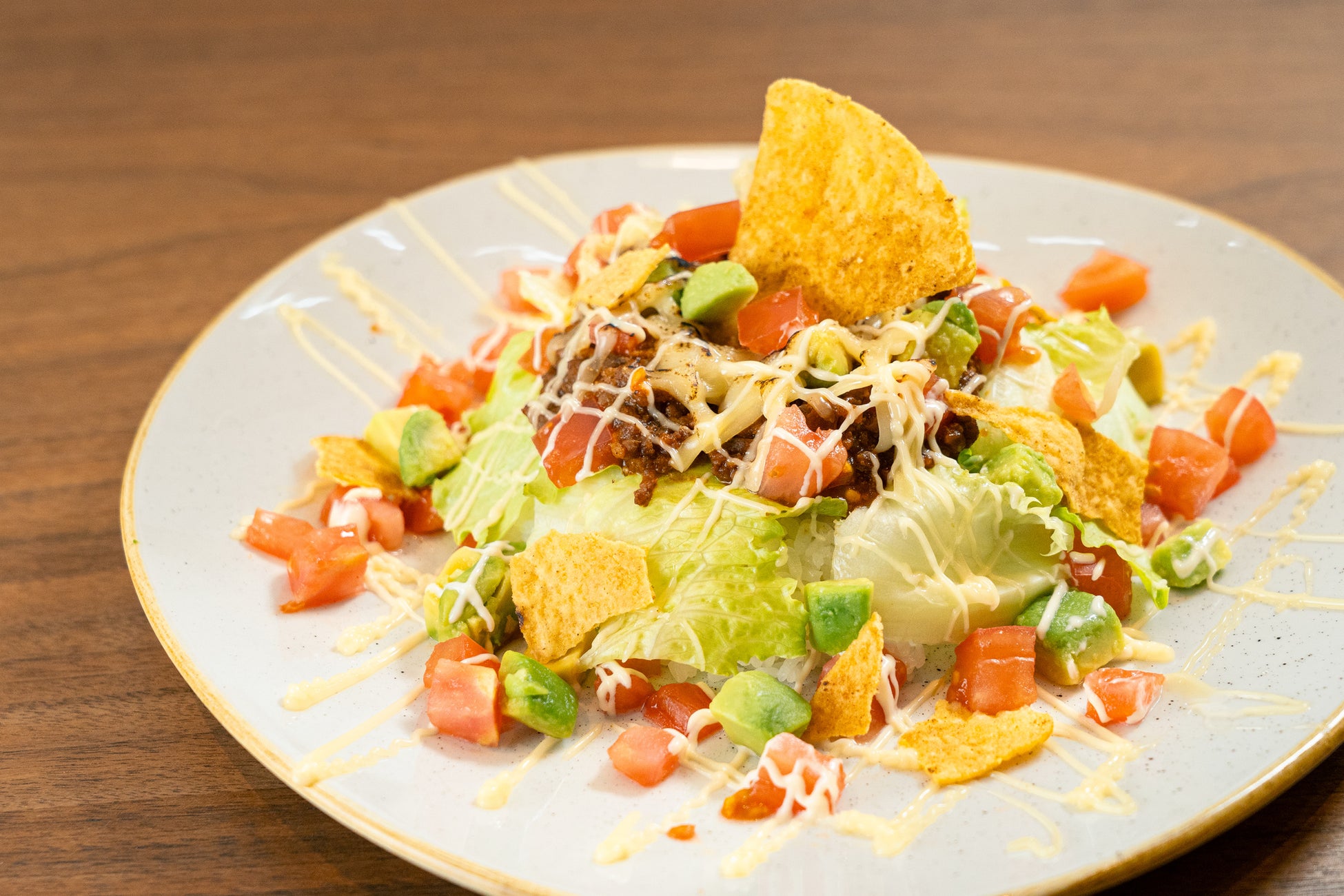 ■タコライス(1,600円税込):ごろっとしたタコミートに、福岡県産の甘みのあるトマトをたっぷり使用。地元の素材で作る、夏にぴったりのスパイシーなごはん。